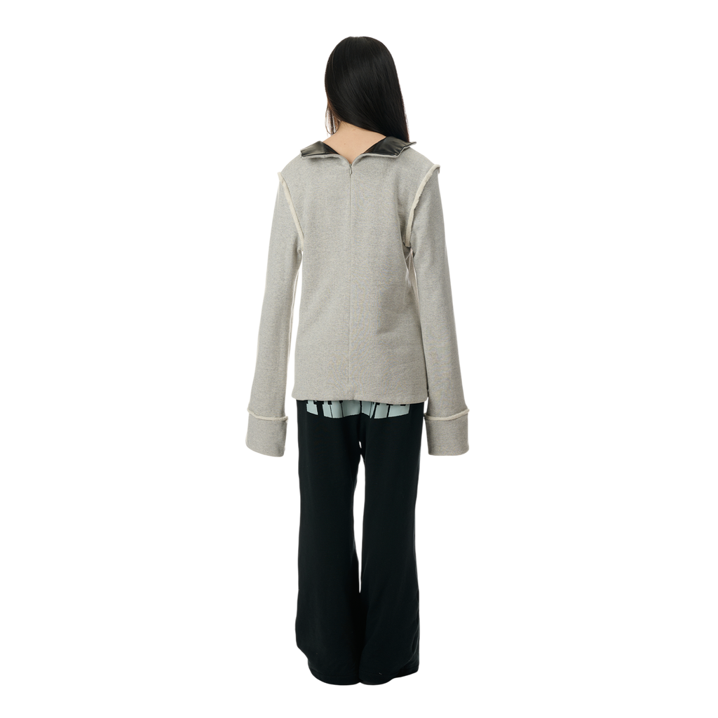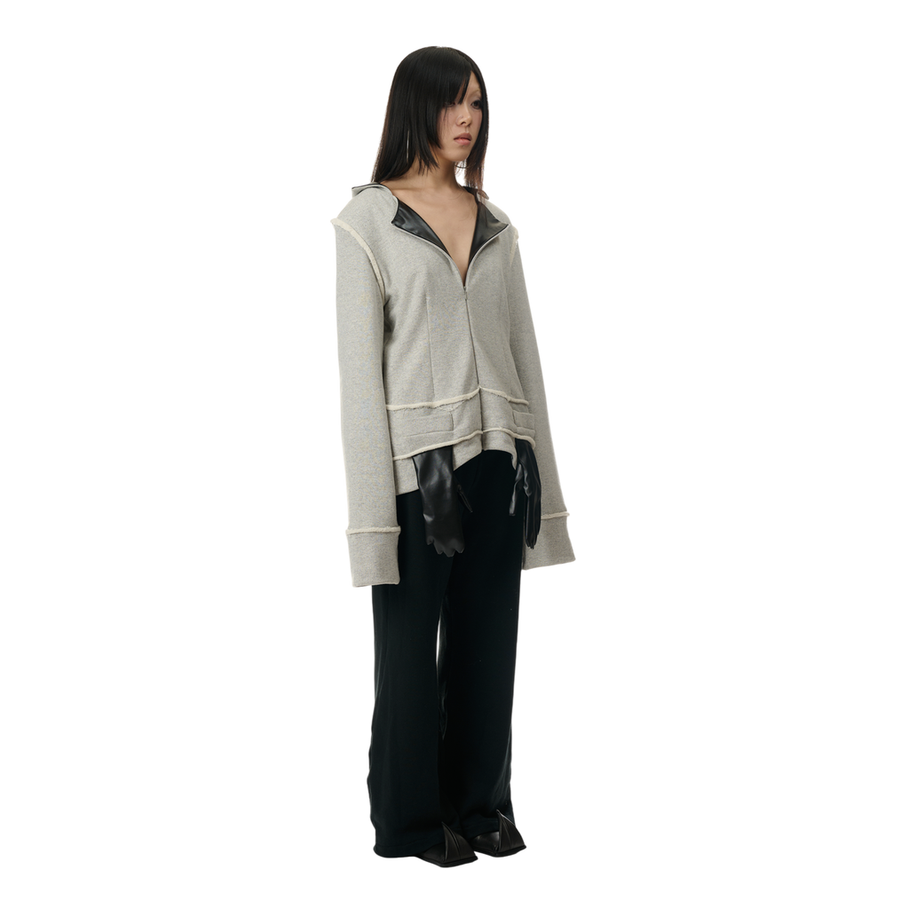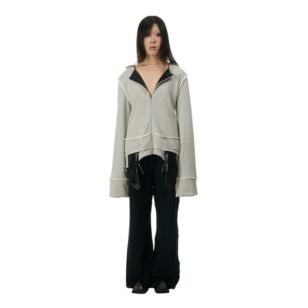 The 100% cotton Sweat Blazer features zippers on both the front and back, allowing customization of the faux leather suit lapels for a versatile look. The glove-shaped pockets serve both as a functional and styling detail.