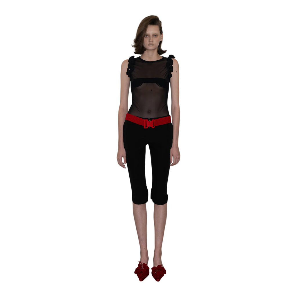 This piece combines a sleek base with playful ruffles, creating a feminine and dynamic look.