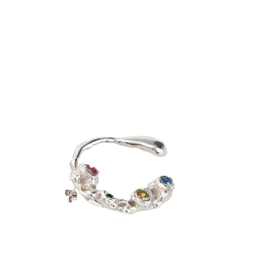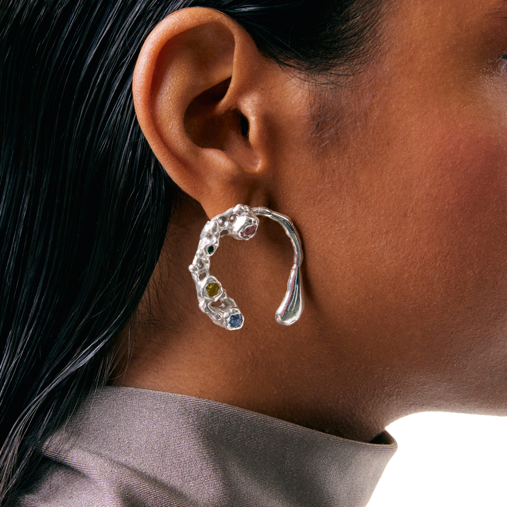 Silver earring with organic shape, holes and little zircons. Butterfly fastening.