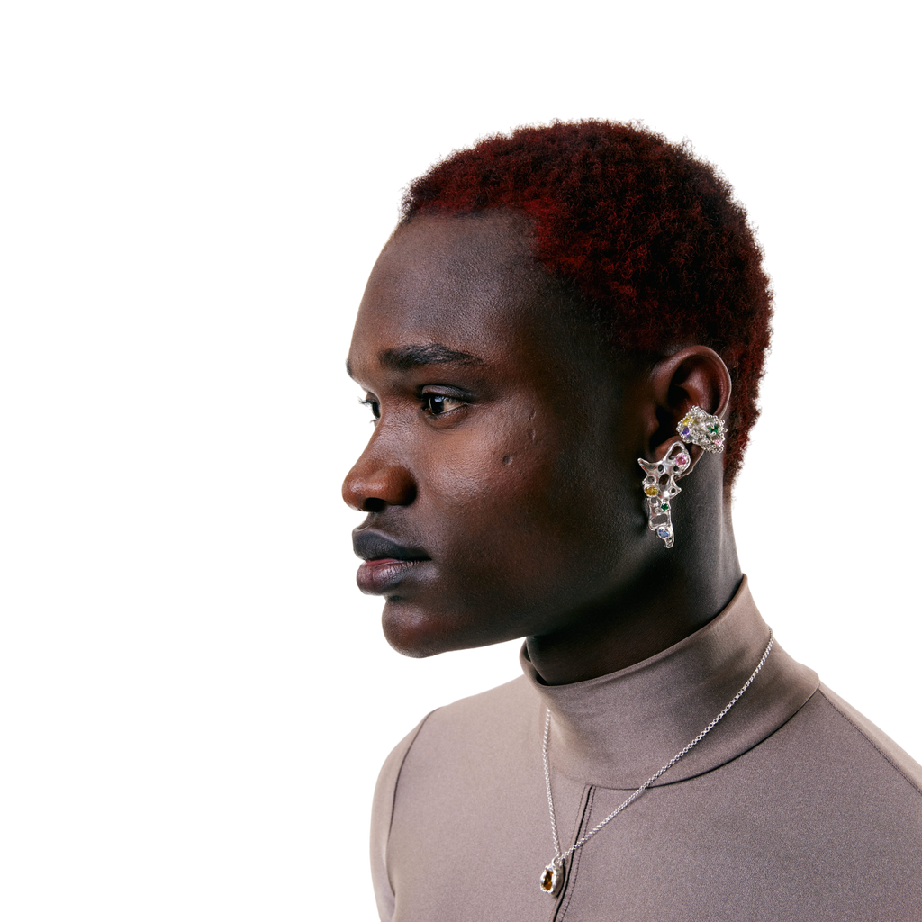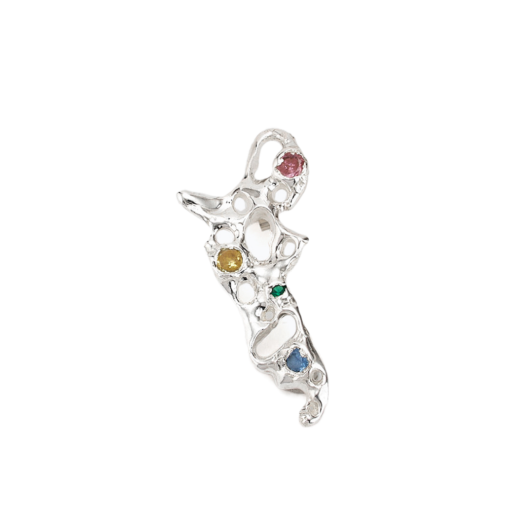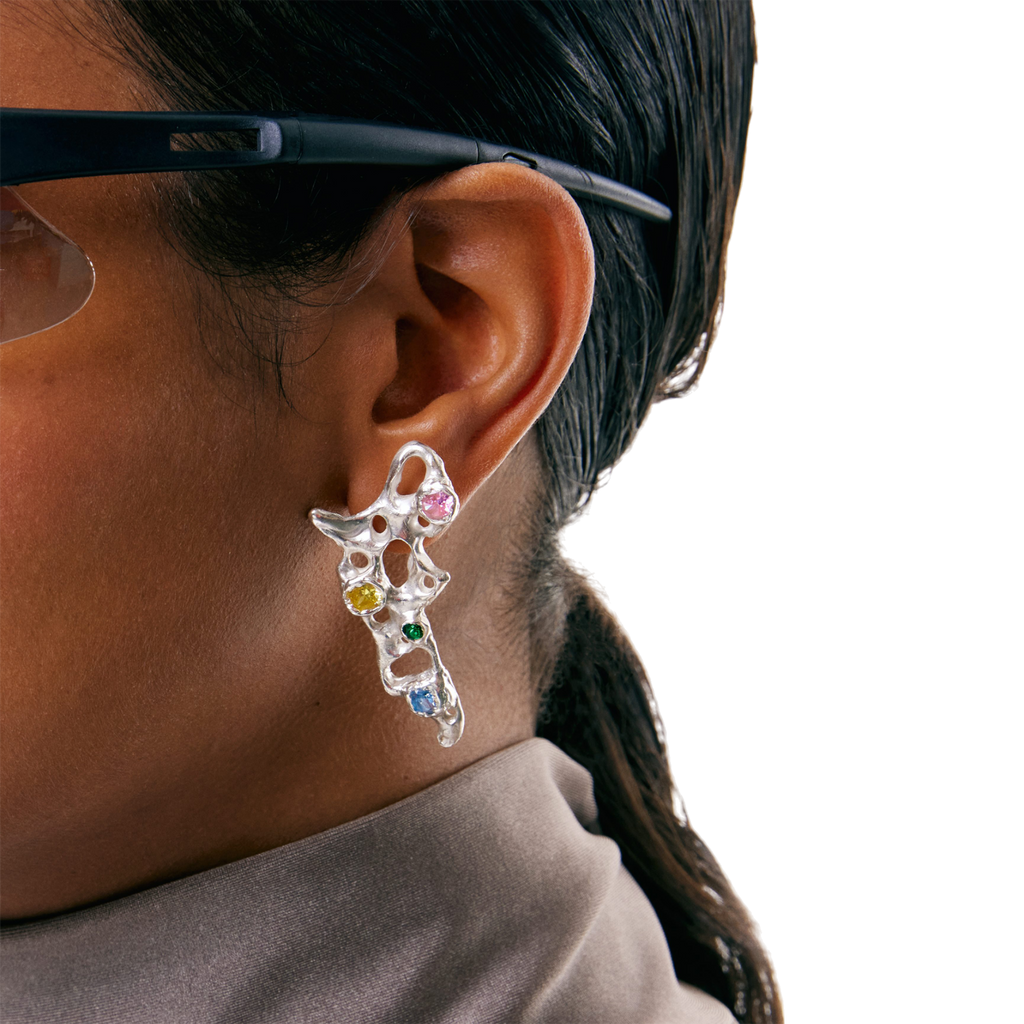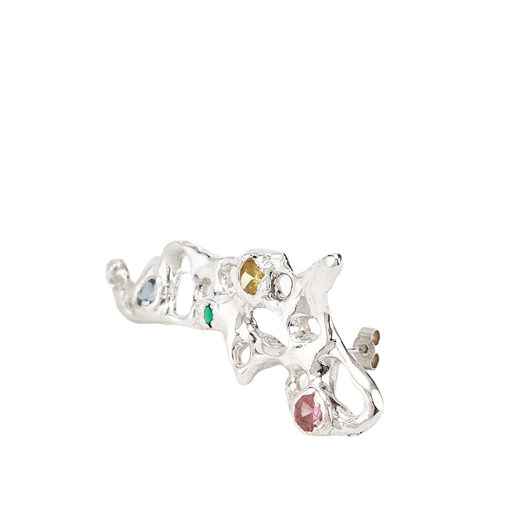 Silver earring with organic shape, holes and little zircons. Butterfly fastening.