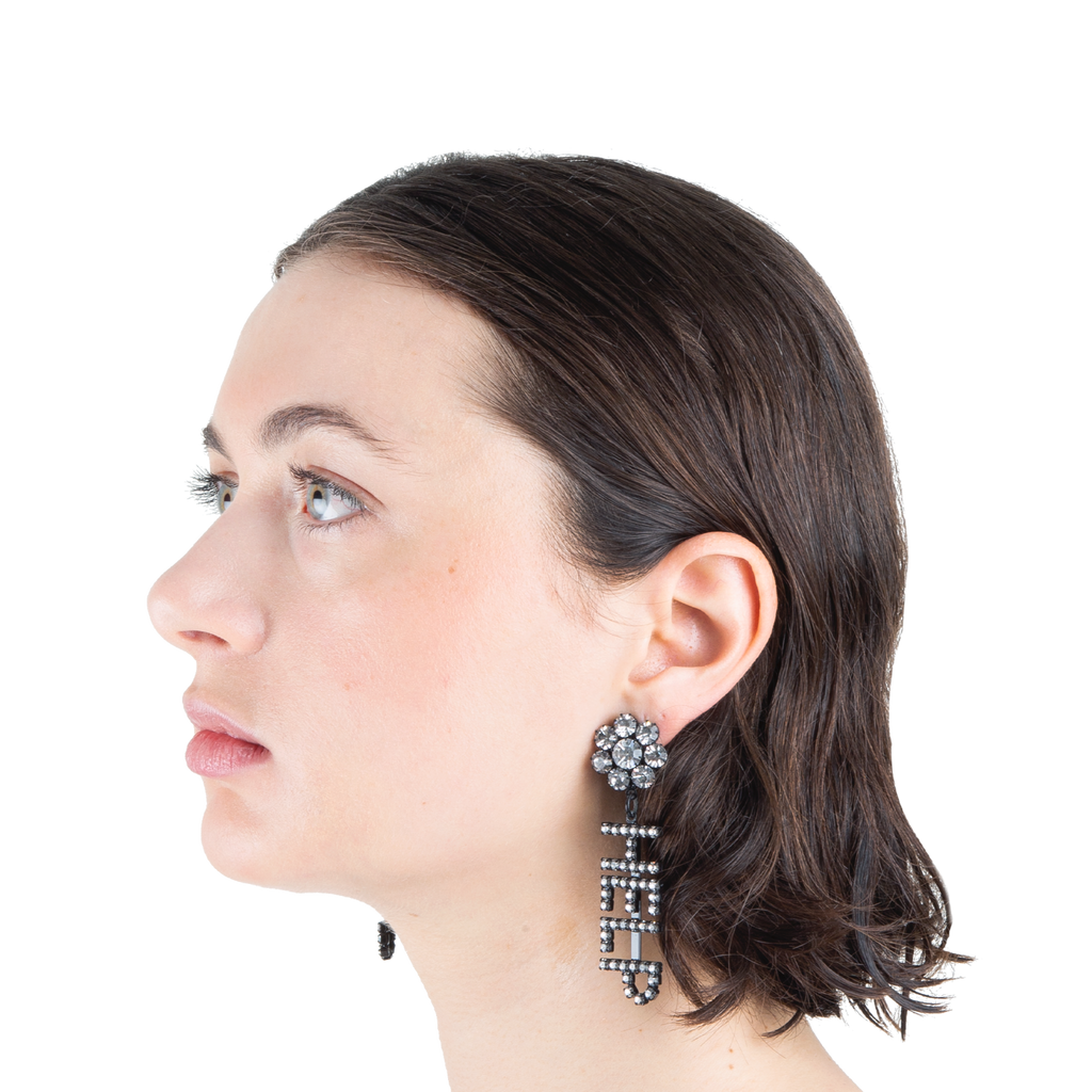 Pair of drop earrings in black metal. Czech crystal detailing throughout. Text at drop. Clip fastening. Approx. 3" drop.