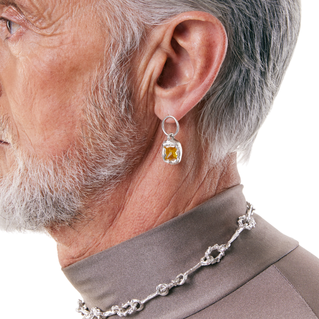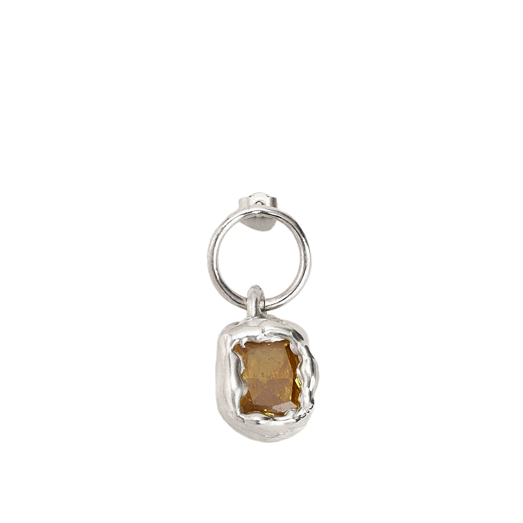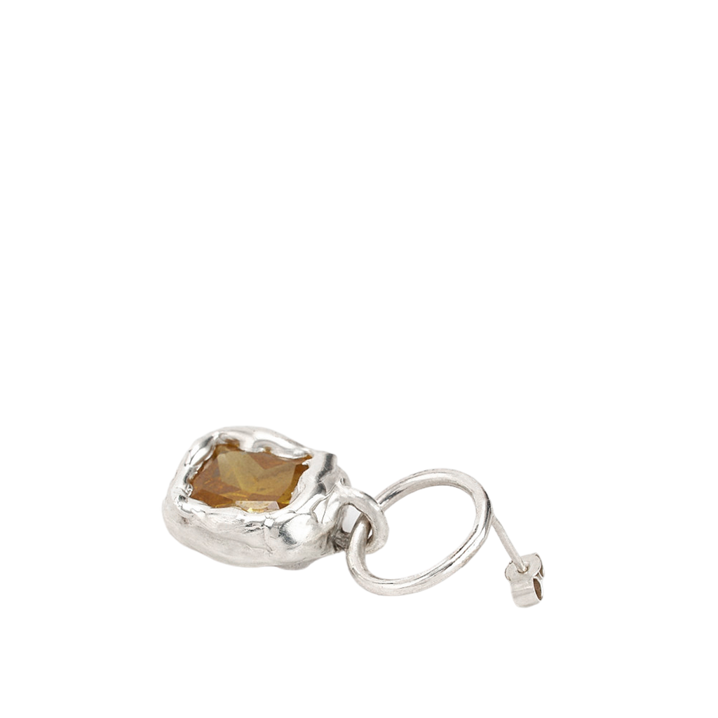 Silver earrings with pendant yellow zircon wraped by little spots. Butterfly fastening.