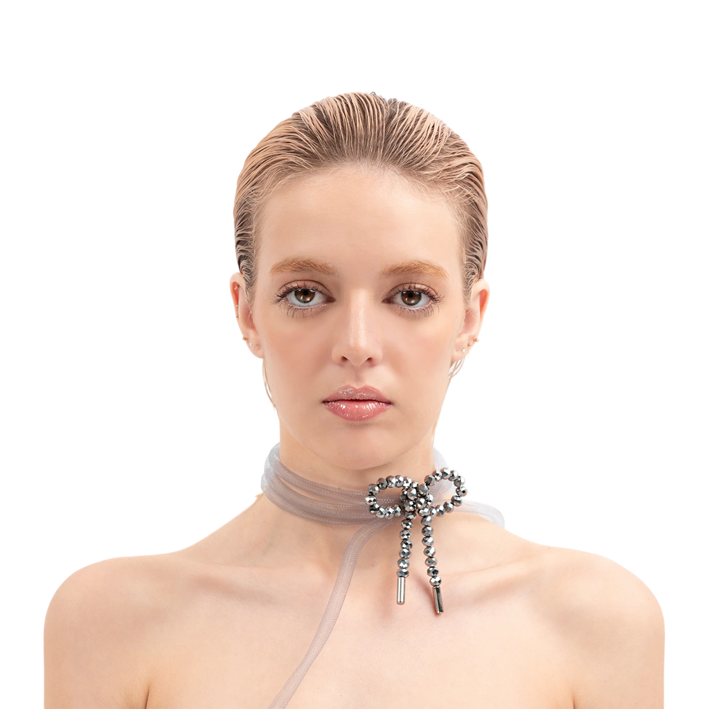 Featuring ABS, jade, and mirror-faceted stones with brass silver end tips, this piece is elegantly mounted on a nylon cord with a light pink coated brass back, finished with a "1" logo engraved on the back for a signature touch.