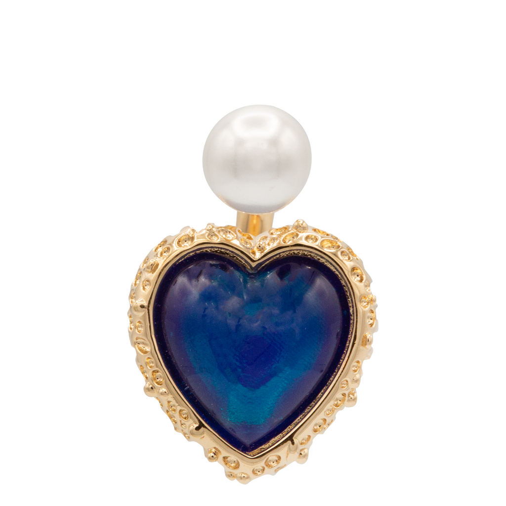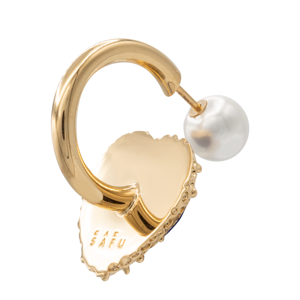 Mini hoop earring with a blue sapphire heart in a golden frame and a pearl on top serving as closure.