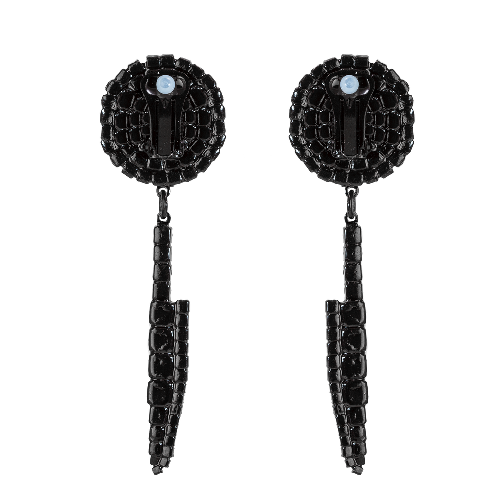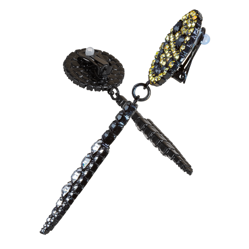 Pair of drop earrings in textured black brass. Crystal-cut graphic in yellow and black at face. Graphic hardware featuring crystal-cut detailing in white, green, and pink at drop. Clip-on fastening. Tonal hardware. Approx. 2.75" drop.