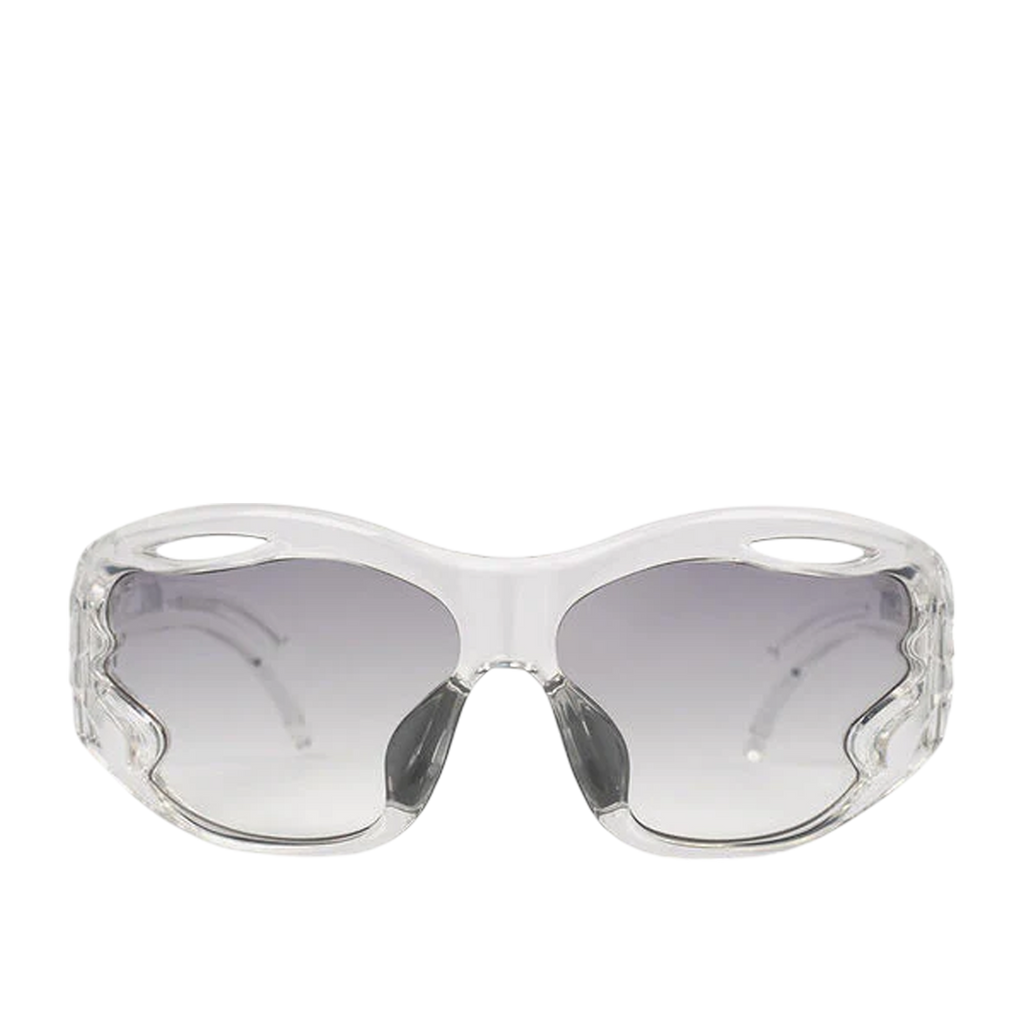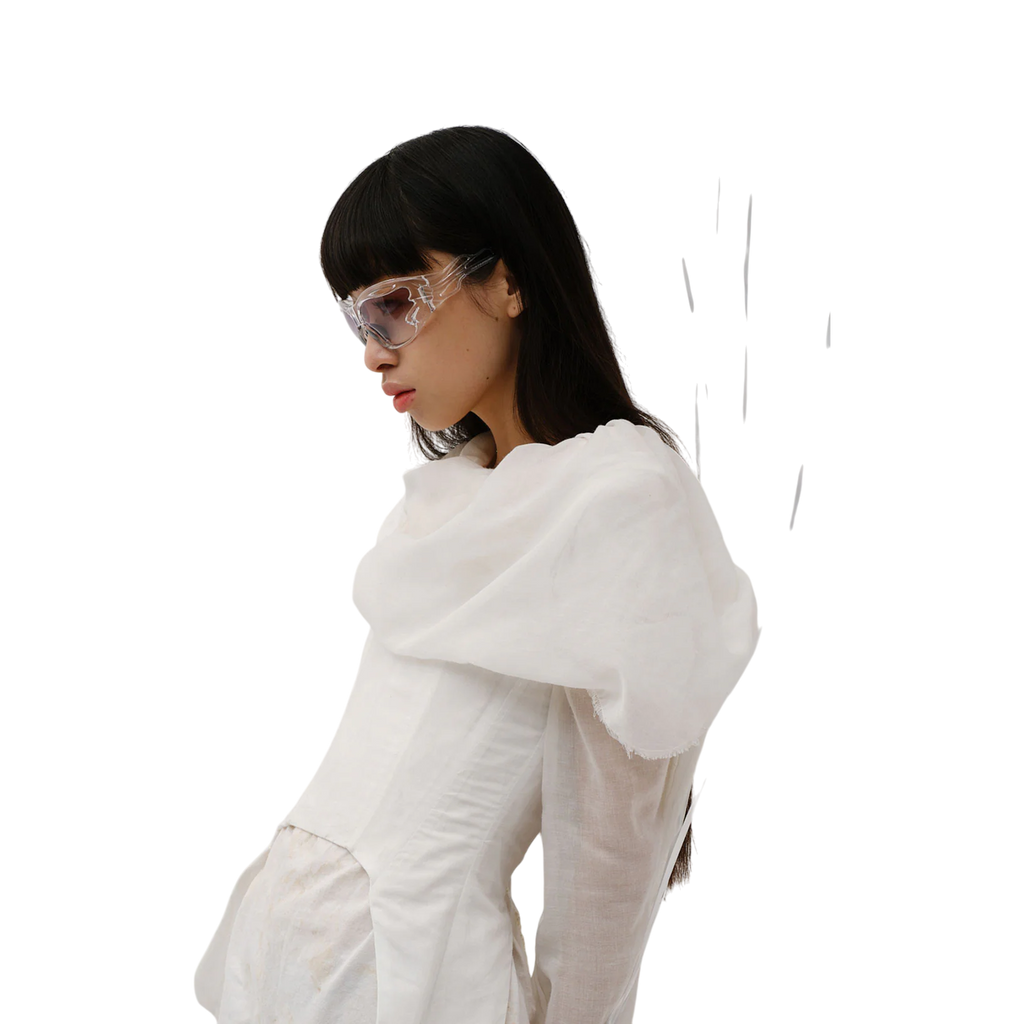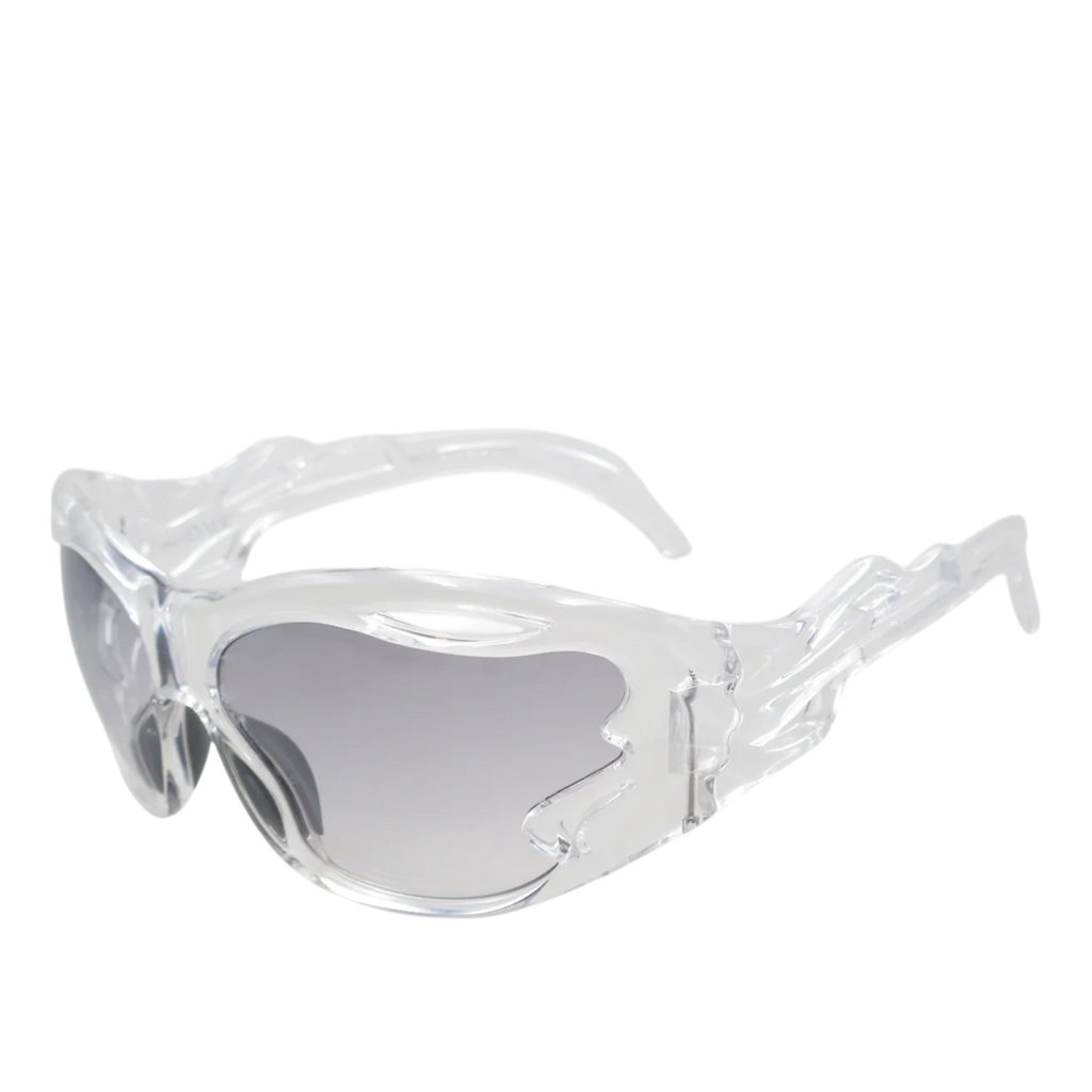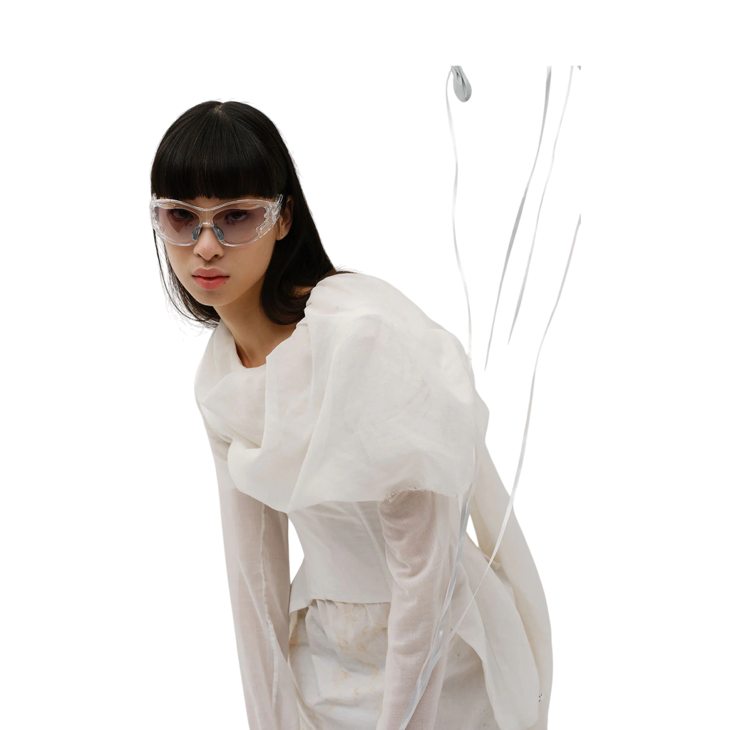 Designed in collaboration with Mo Eyewear, these unisex sunglasses take inspiration from artificial intelligence, featuring sculpted frames with fluid cut-outs that distort traditional form and function. The seamless integration of lenses and frames creates a striking monochromatic aesthetic.