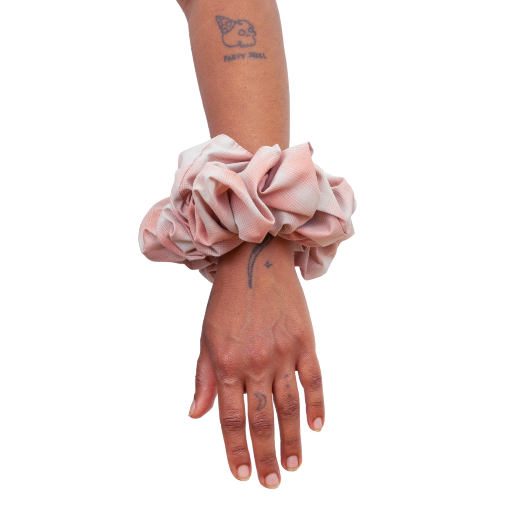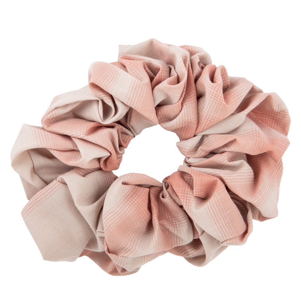 Elasticized cotton poplin scrunchie in taupe featuring check pattern in pink. Gathering throughout.