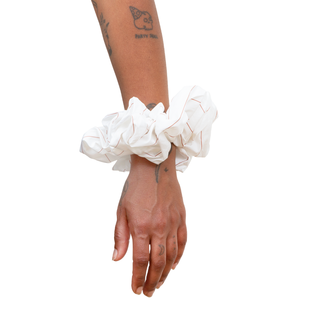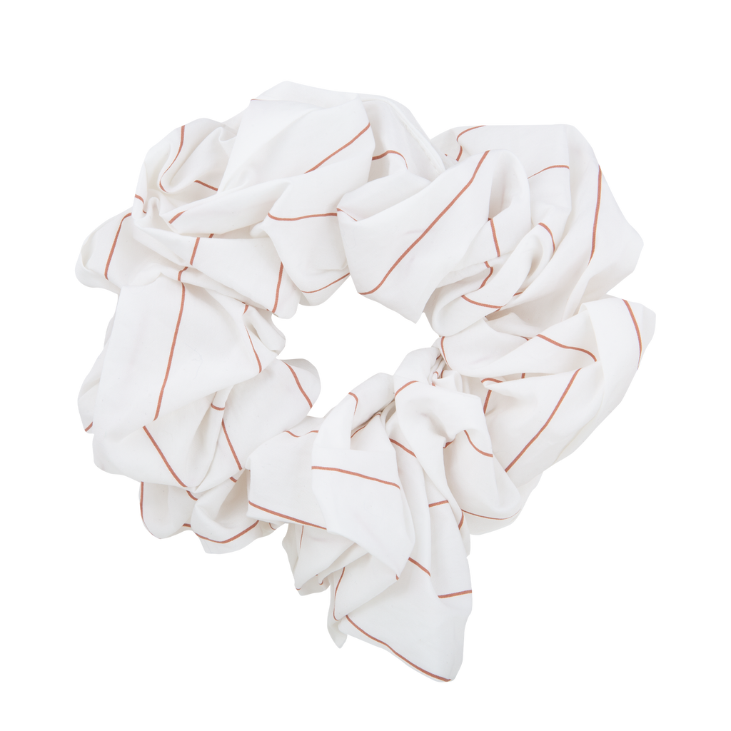 Elasticized cotton shirting scrunchie in crimson pinstripe