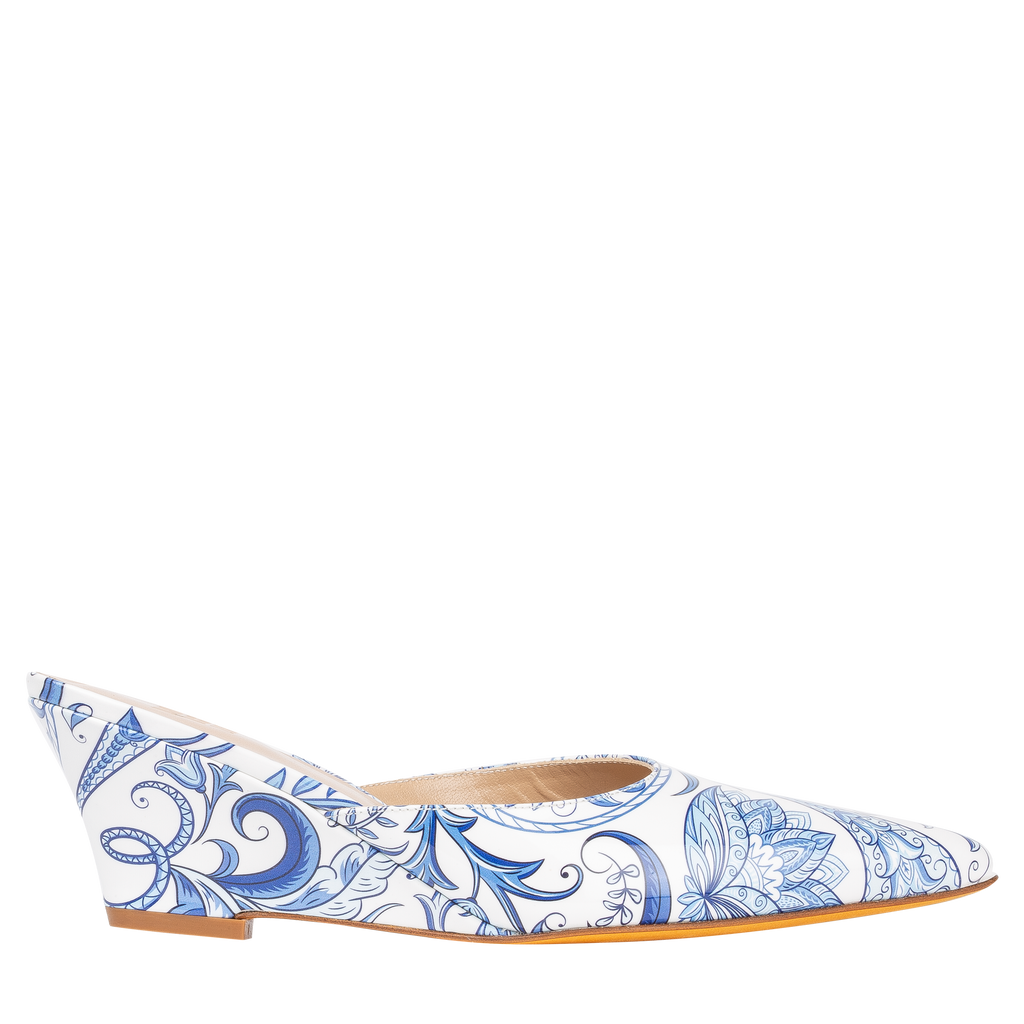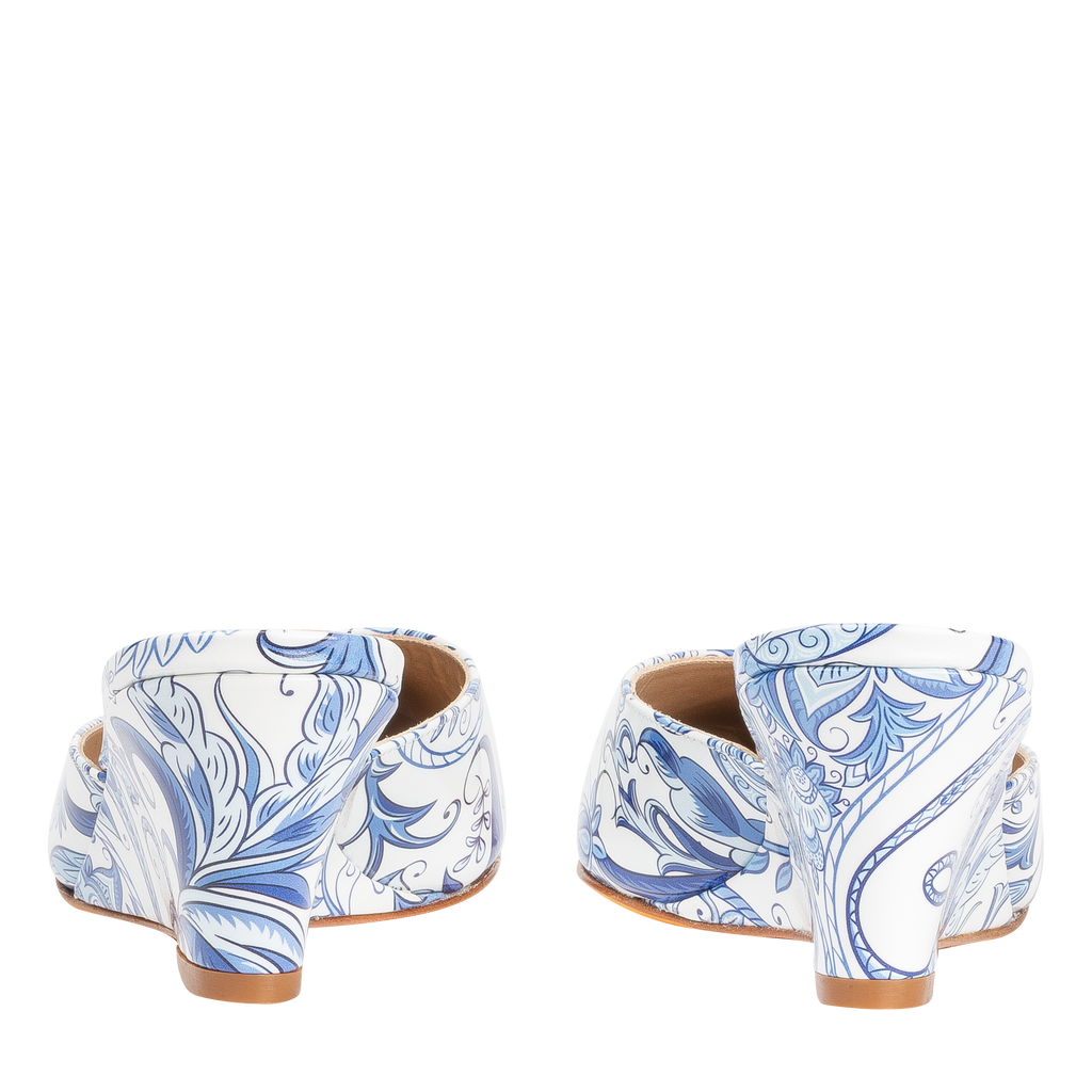 A pointed toe slide with sculpted wedge heel. 7.5cm heel height. True to size with a narrow fit.
