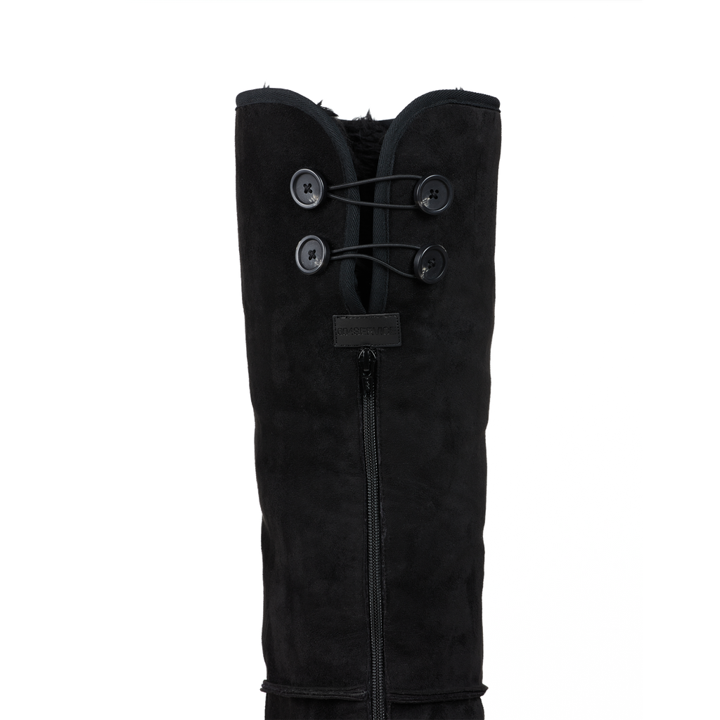 This product is custom-made and production will begin immediately once the order is confirmed. Therefore, exchanges and returns are not possible. The production time is approx. 2 weeks. These boots are over-knee length and feature high quality thermal faux sheep fur lining, o-shaped ring pierced detail and button closure details. Very comfortable to wear.