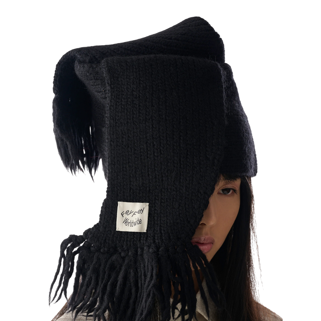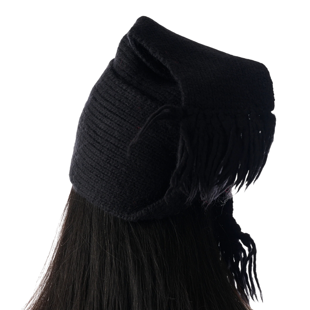 Handcrafted rib-knit wool hat in black constructed to resemble a scarf wrapped around the head.