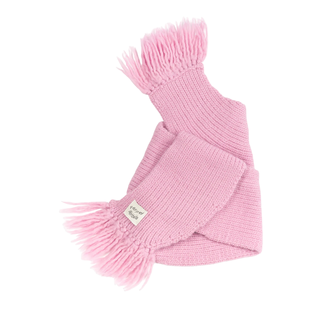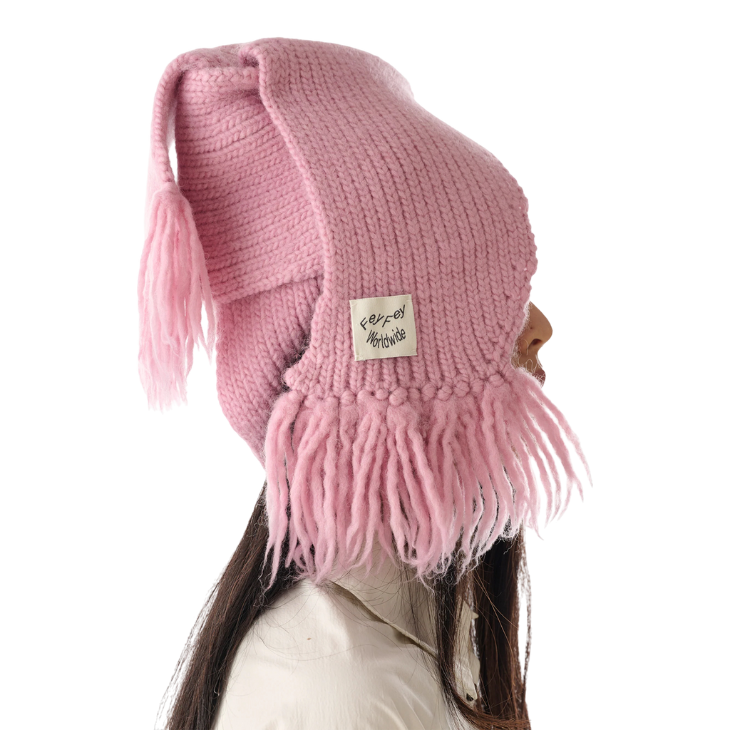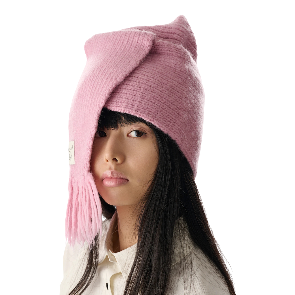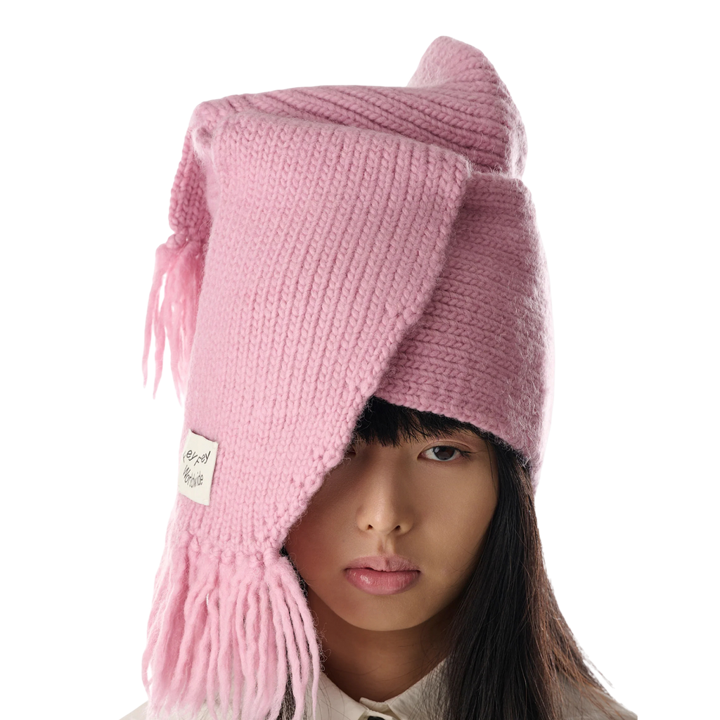 Handcrafted rib-knit wool hat in pink constructed to resemble a scarf wrapped around the head.