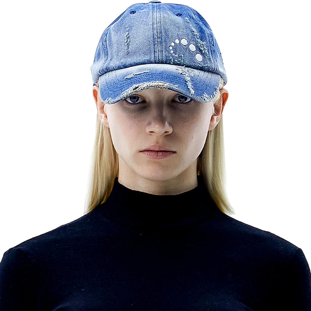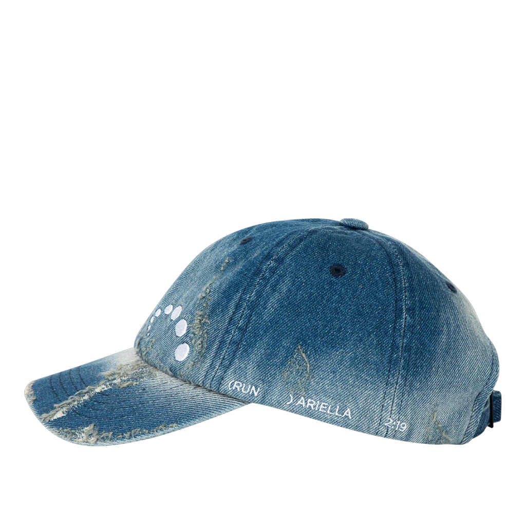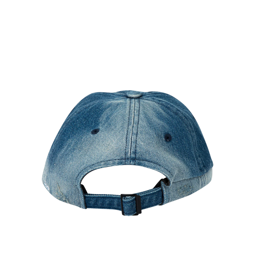 Made from authentic Japanese denim, our unifit baseball cap features a classic shape and an adjustable buckle at the back for a comfortable fit. The front is embroidered with our logo, while the left side features an embroidery of the season soundtrack. A folded line detail on the right side adds a stylish touch. Finished with a destroyed, washed-out effect, this cap is a perfect blend of style and comfort.
