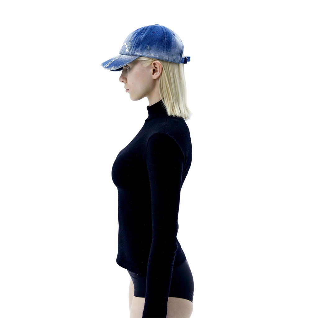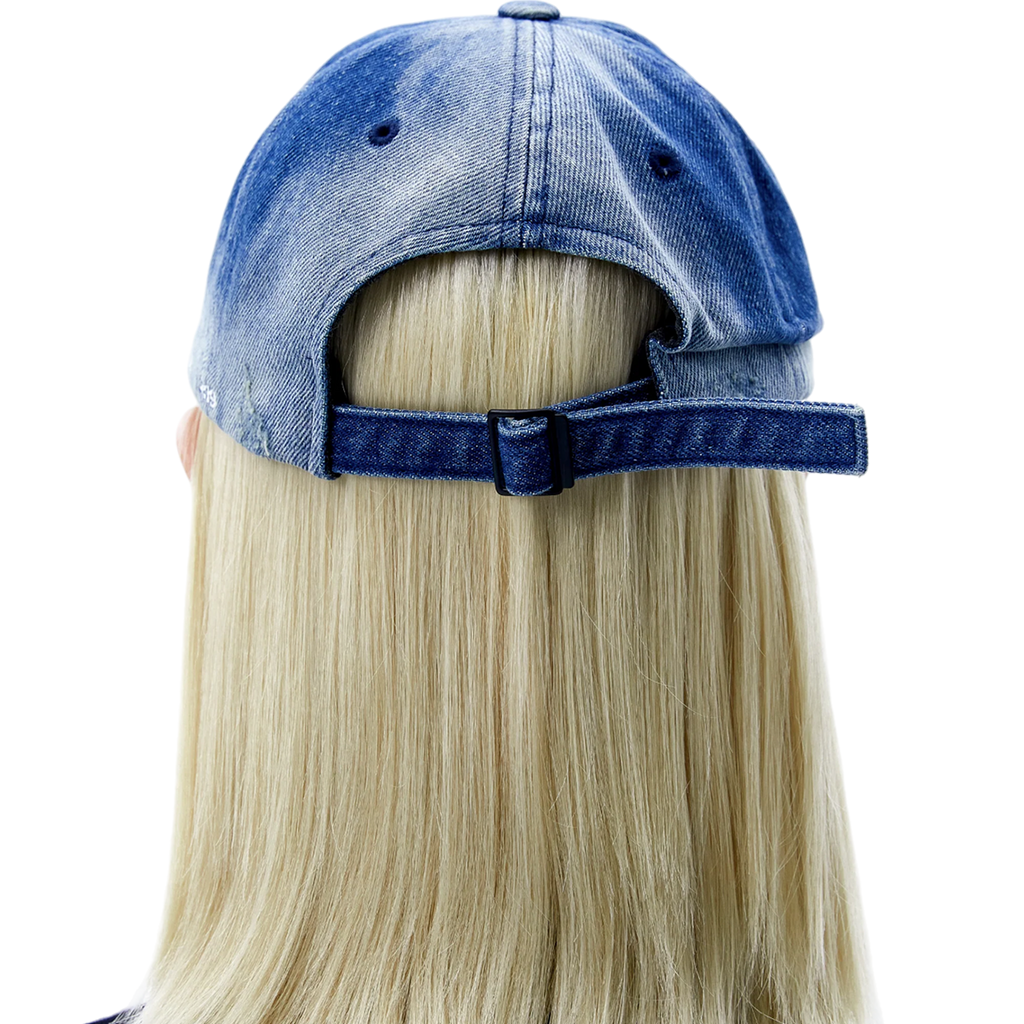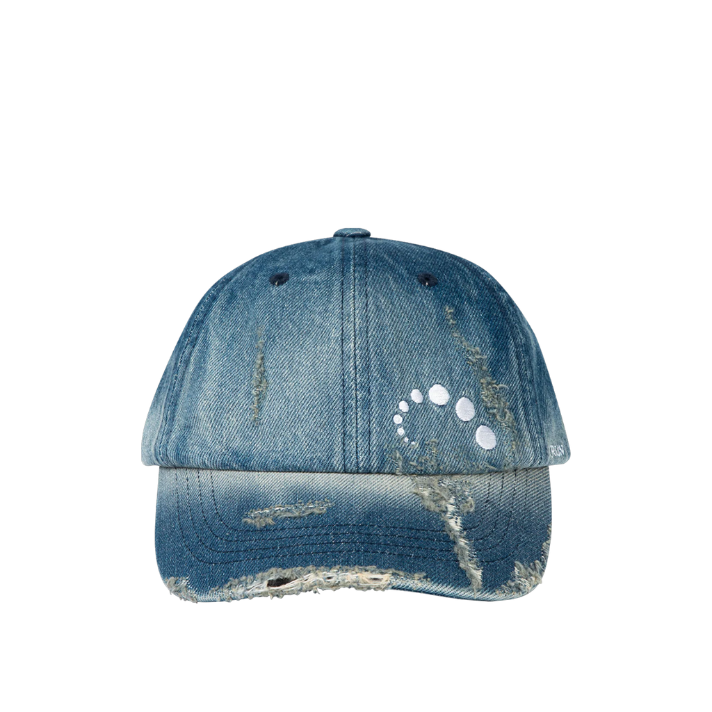 Made from authentic Japanese denim, our unifit baseball cap features a classic shape and an adjustable buckle at the back for a comfortable fit. The front is embroidered with our logo, while the left side features an embroidery of the season soundtrack. A folded line detail on the right side adds a stylish touch. Finished with a destroyed, washed-out effect, this cap is a perfect blend of style and comfort.