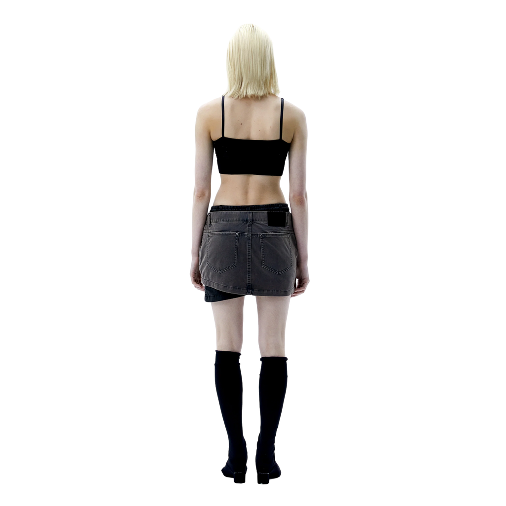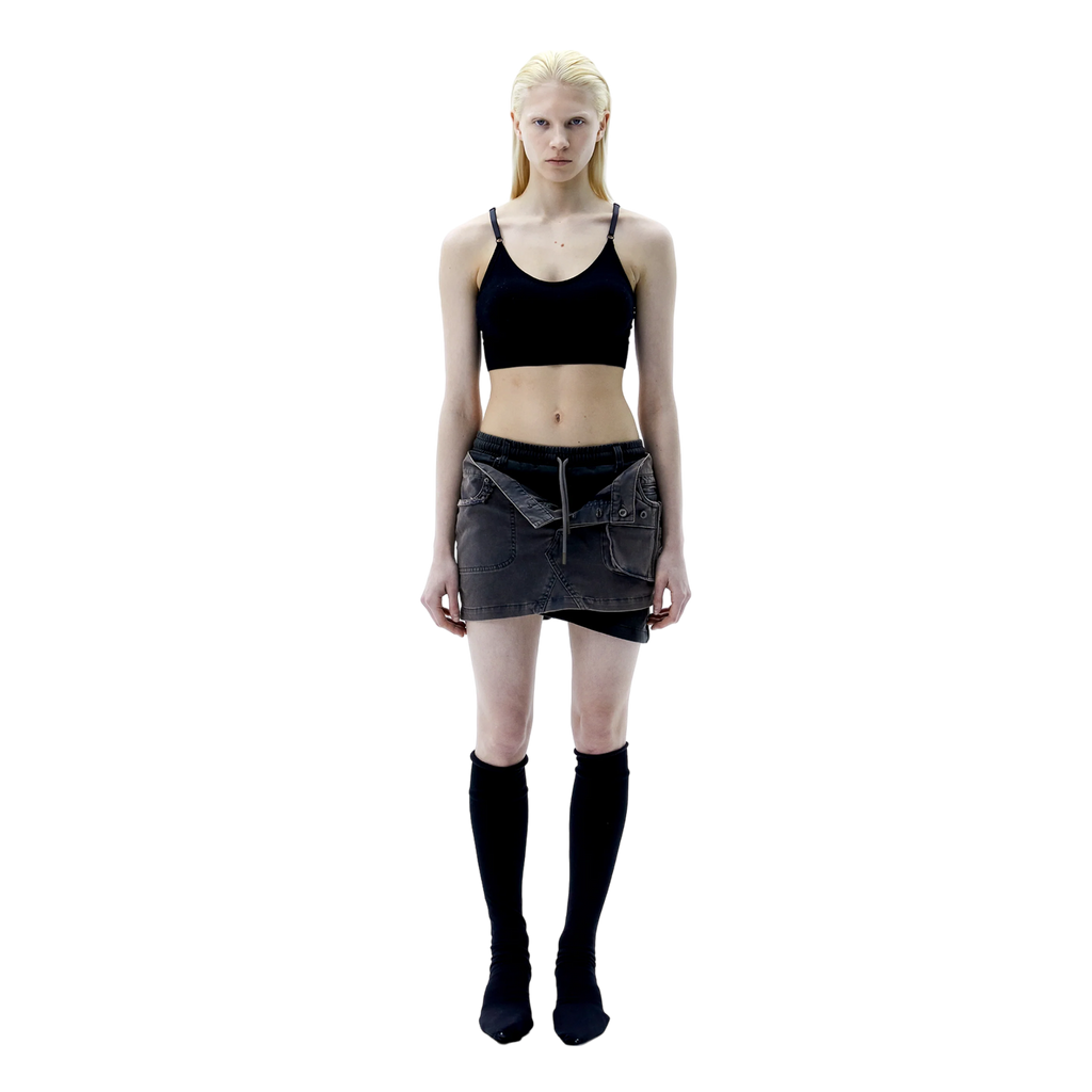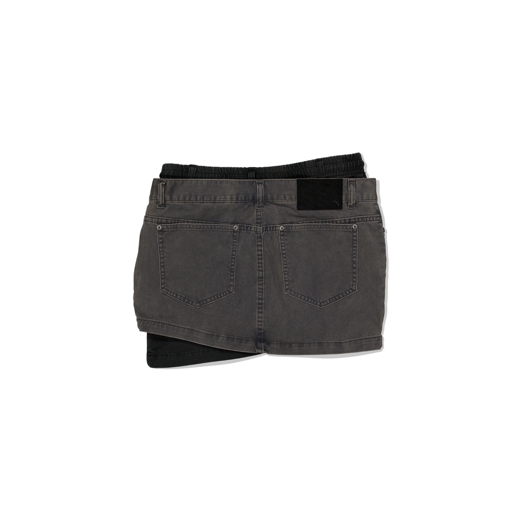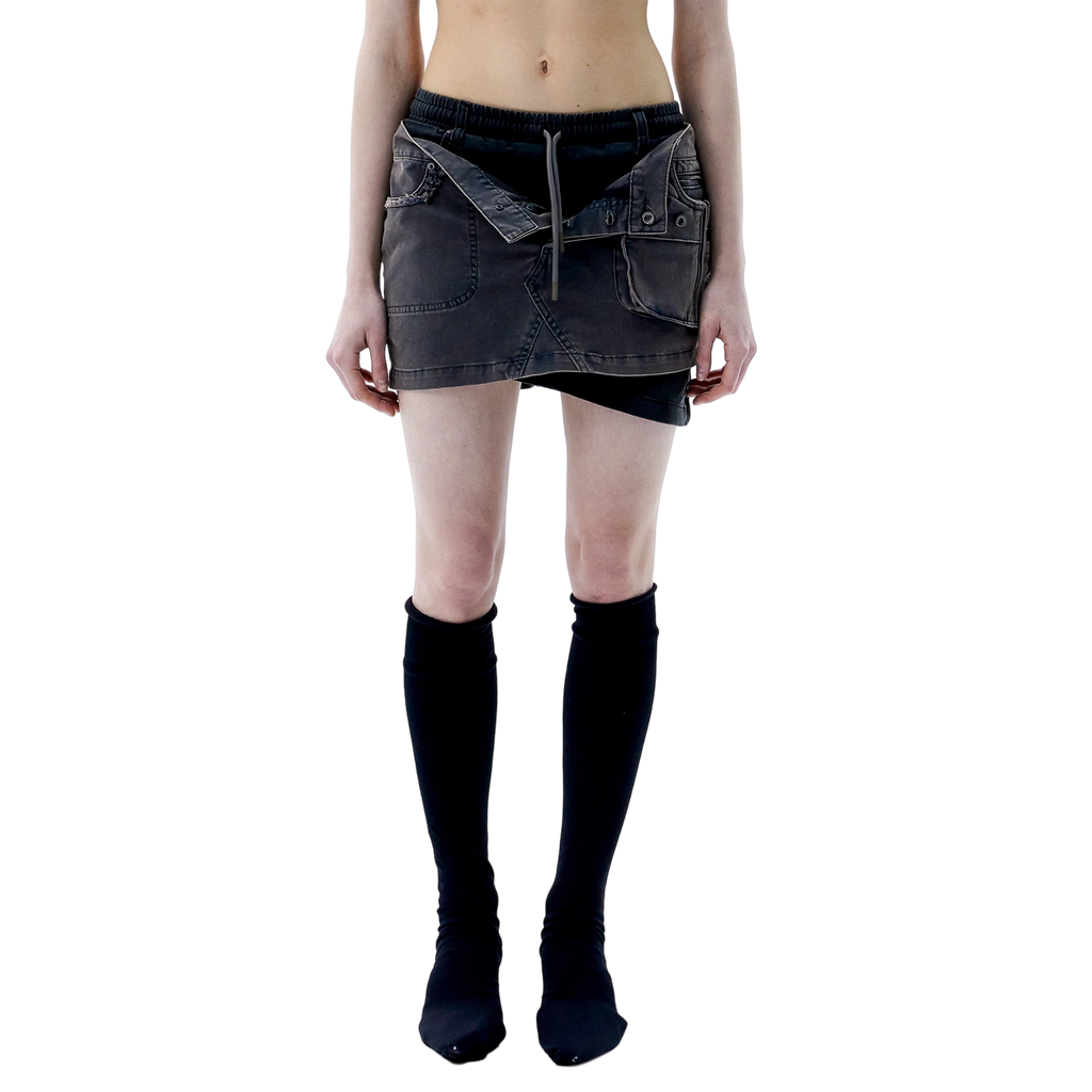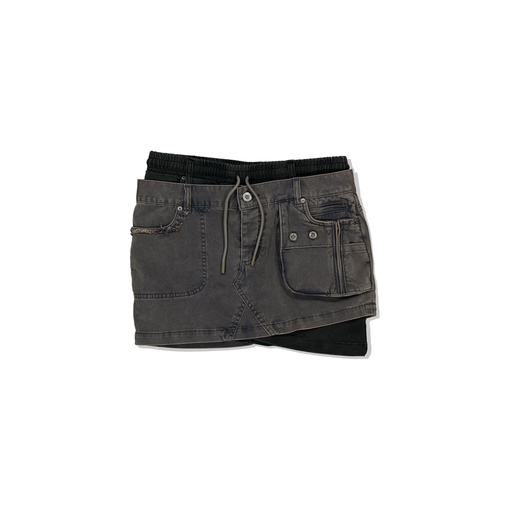Crafted from Japanese cotton, our low-waist skirt features a double-layered design for a unique look. It is adorned with logo-engraved flex buttons and a logo inlaid suede patch at the back for a touch of luxury. The skirt includes an elastic band and drawcord at the waistband for a comfortable and adjustable fit. It is designed with one patched pocket at the left-hand front, two pockets at the outside skirt's front, and one pocket at the inside skirt's right-hand front for added functionality. Additionally, there are two pockets at the outside skirt's back. The skirt is finished with a double washed-out effect for a trendy, worn-in look.