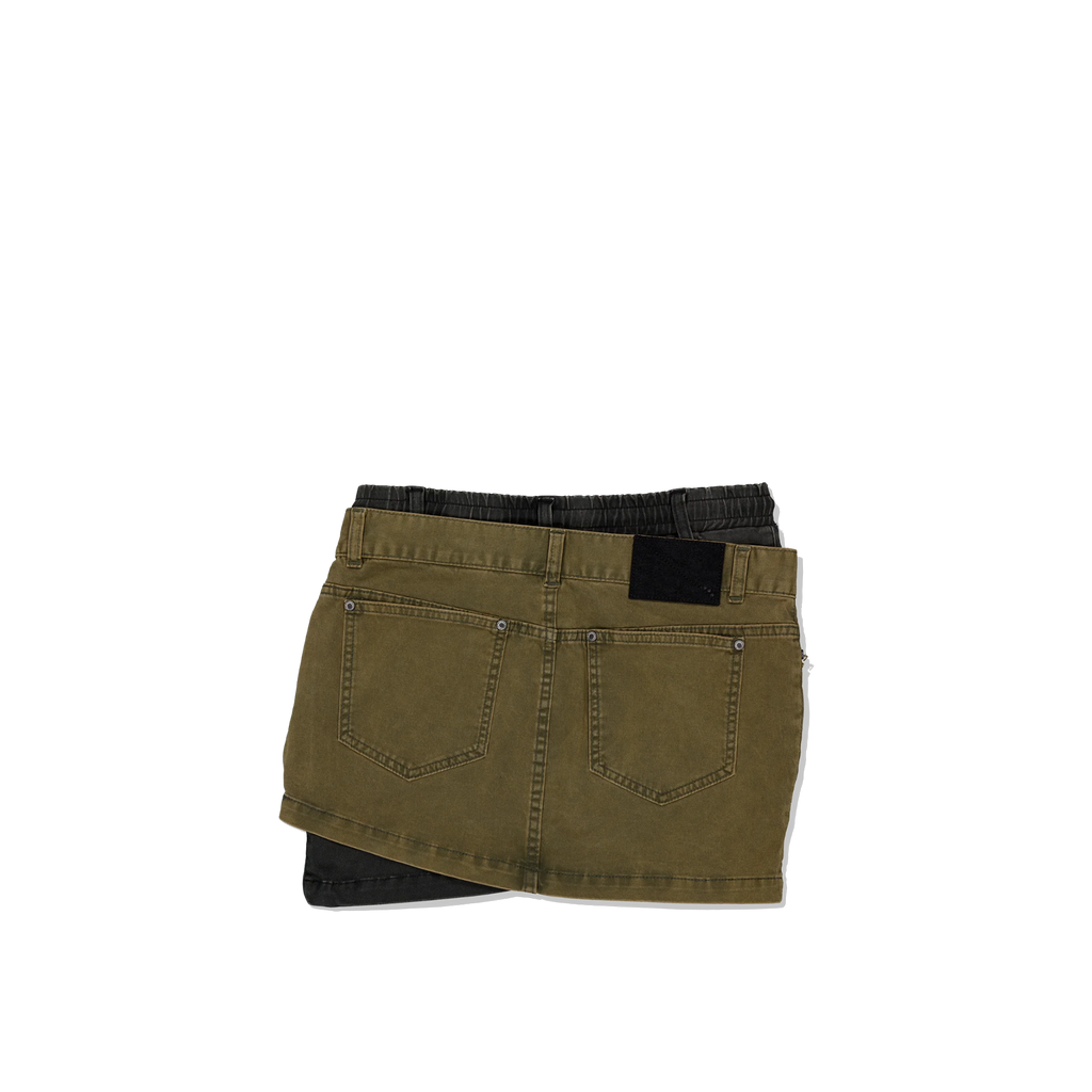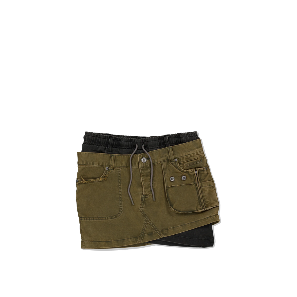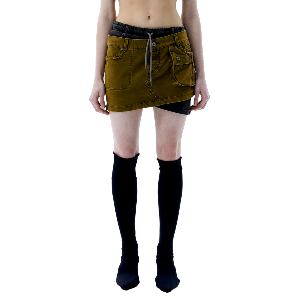 Crafted from Japanese cotton, our low-waist skirt features a double-layered design for a unique look. It is adorned with logo-engraved flex buttons and a logo inlaid suede patch at the back for a touch of luxury. The skirt includes an elastic band and drawcord at the waistband for a comfortable and adjustable fit. It is designed with one patched pocket at the left-hand front, two pockets at the outside skirt's front, and one pocket at the inside skirt's right-hand front for added functionality. Additionally, there are two pockets at the outside skirt's back. The skirt is finished with a double washed-out effect for a trendy, worn-in look.