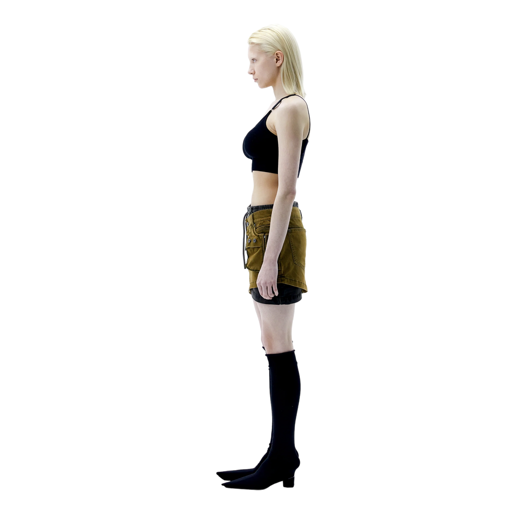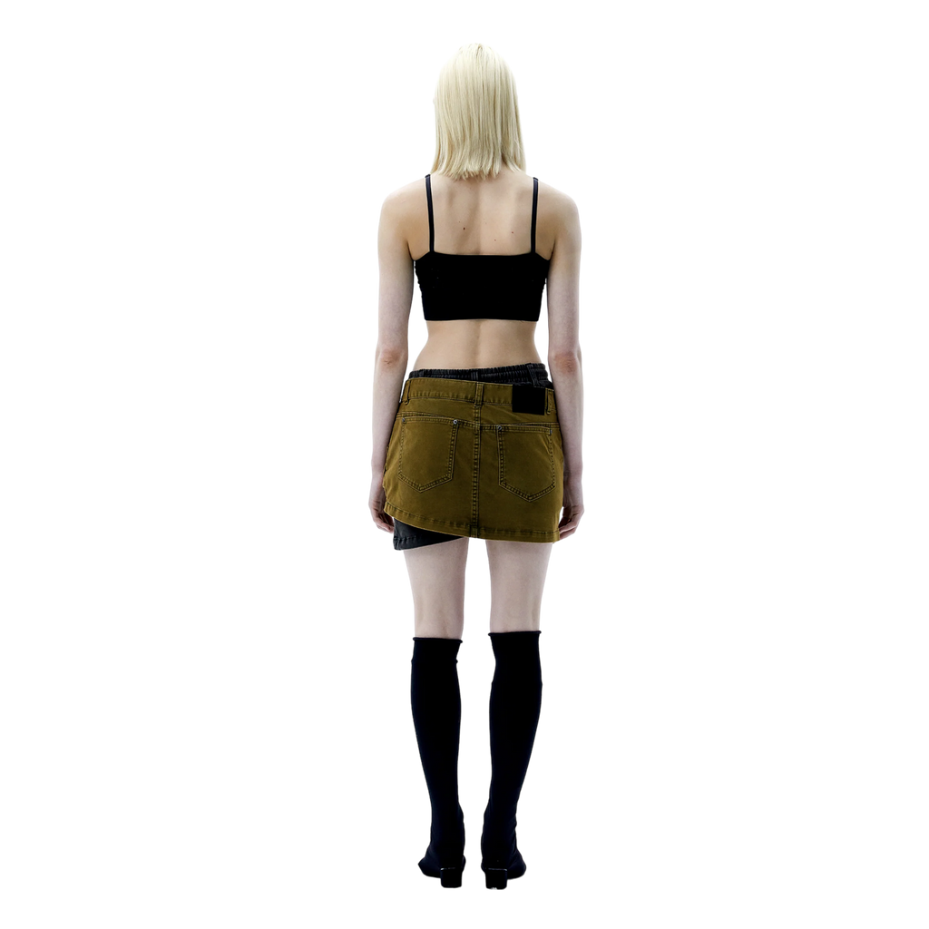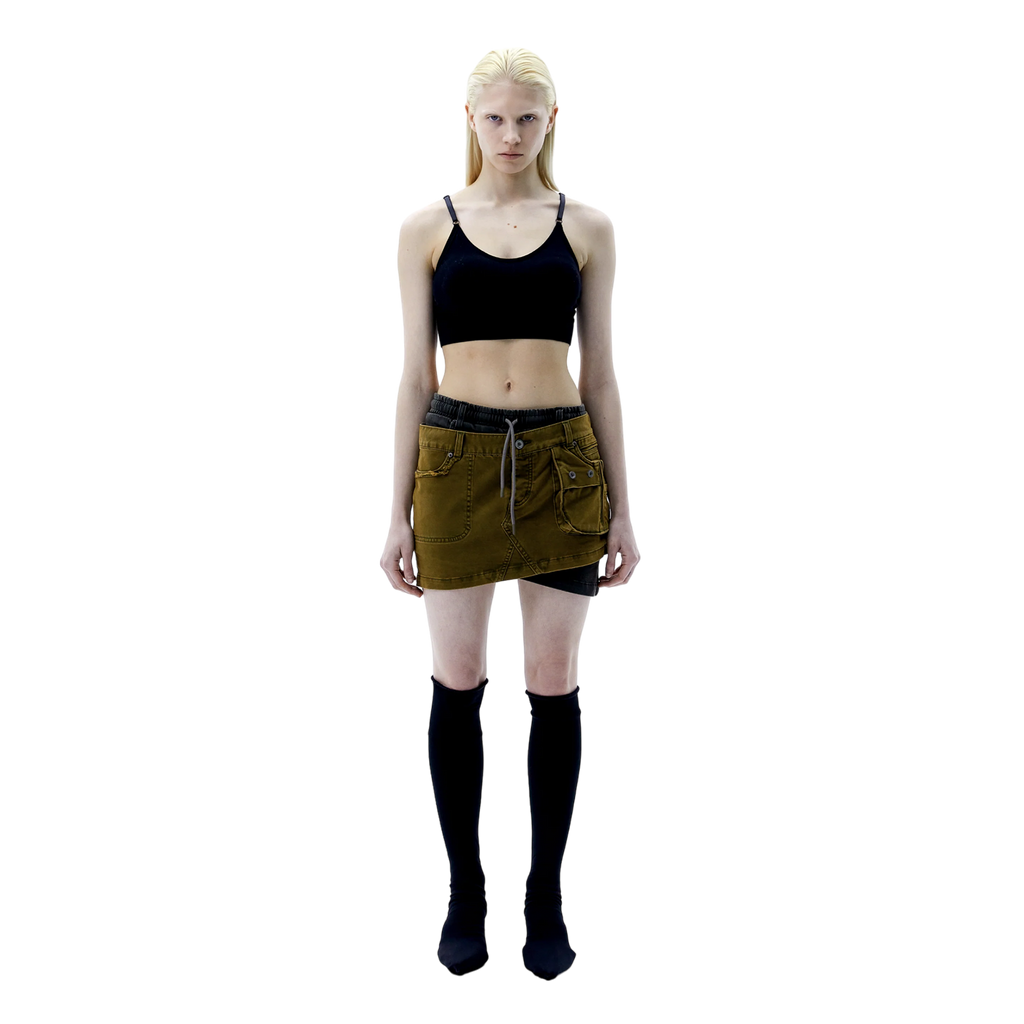 Crafted from Japanese cotton, our low-waist skirt features a double-layered design for a unique look. It is adorned with logo-engraved flex buttons and a logo inlaid suede patch at the back for a touch of luxury. The skirt includes an elastic band and drawcord at the waistband for a comfortable and adjustable fit. It is designed with one patched pocket at the left-hand front, two pockets at the outside skirt's front, and one pocket at the inside skirt's right-hand front for added functionality. Additionally, there are two pockets at the outside skirt's back. The skirt is finished with a double washed-out effect for a trendy, worn-in look.