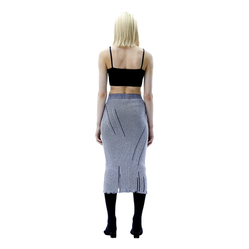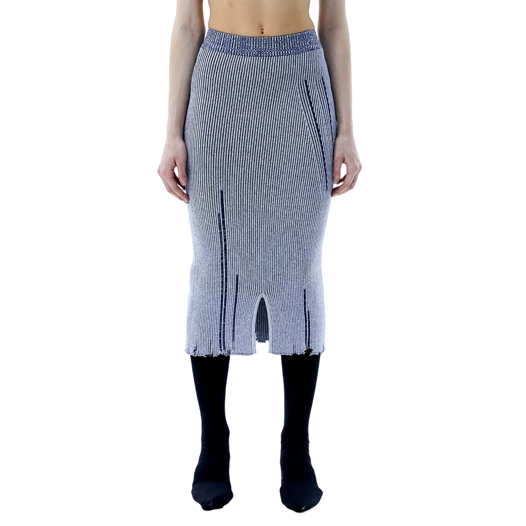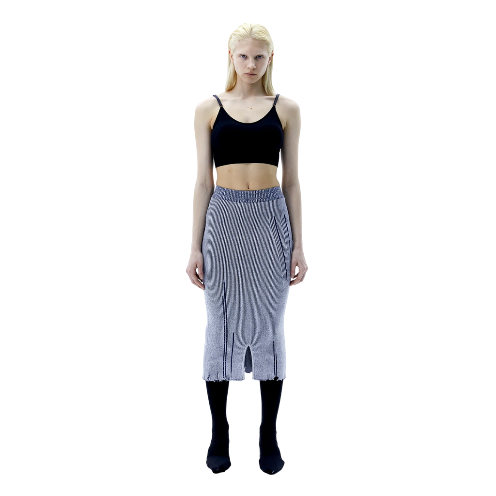 Crafted from soft cotton ribbed knit, our skirt offers a flattering bodycon fit with a mid-waist design. The skirt features an elasticated waistband for comfort and is designed to fall just under the knee. It includes a short slit at the front and a cutting effect at the bottom for added style. The skirt is finished with an asymmetric damage line at the front and back, adding a unique and edgy touch to the overall look.