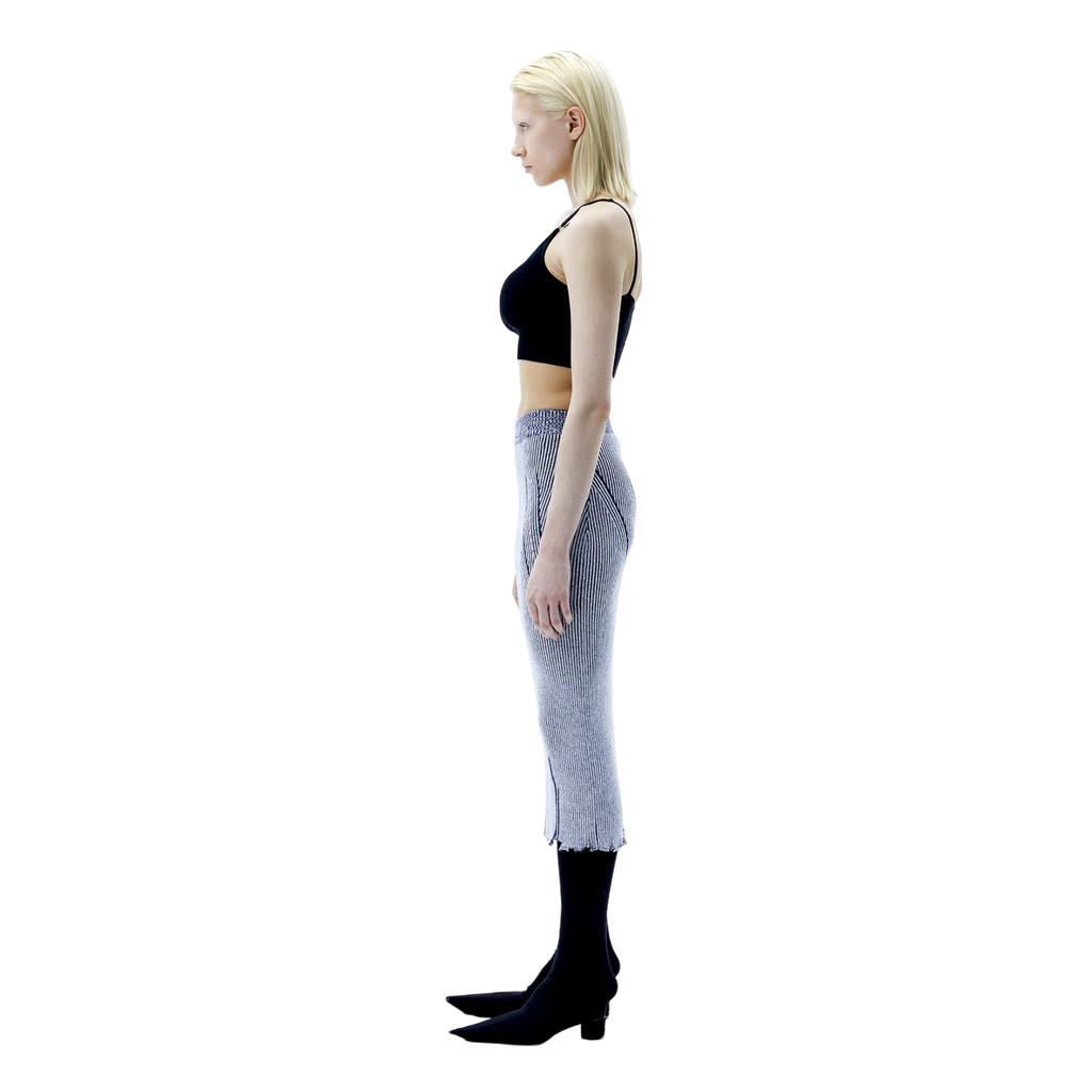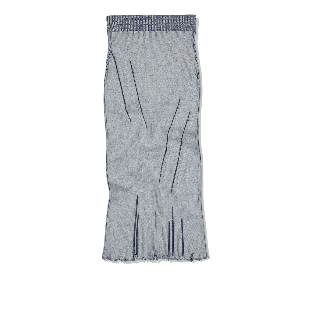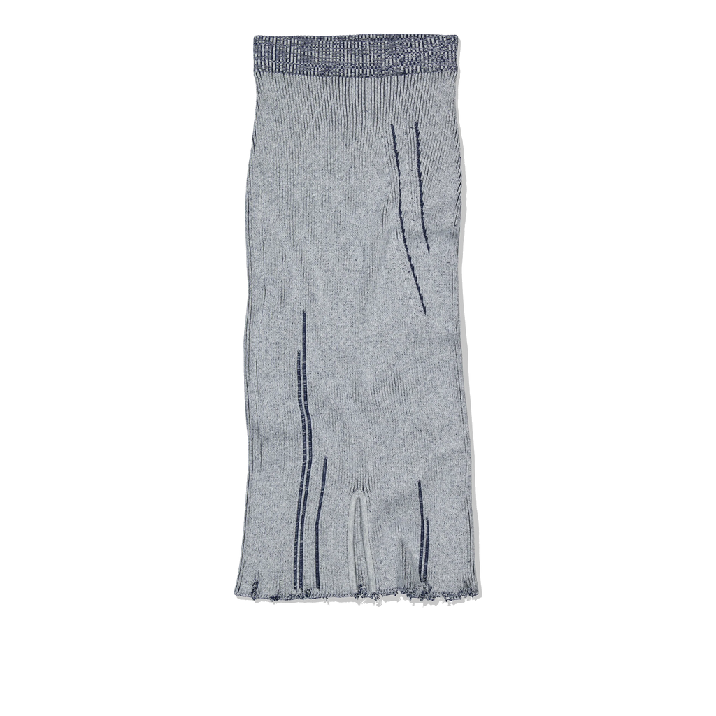 Crafted from soft cotton ribbed knit, our skirt offers a flattering bodycon fit with a mid-waist design. The skirt features an elasticated waistband for comfort and is designed to fall just under the knee. It includes a short slit at the front and a cutting effect at the bottom for added style. The skirt is finished with an asymmetric damage line at the front and back, adding a unique and edgy touch to the overall look.