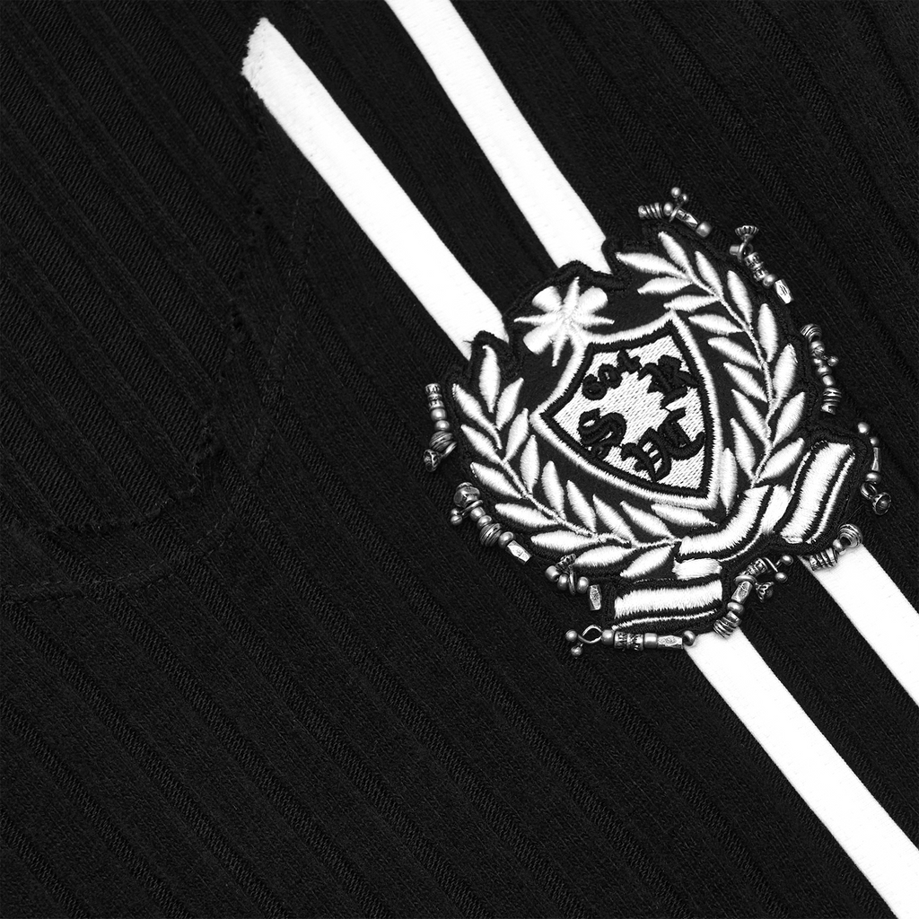 This slim-fit item features a random pattern and showcases the embroidered 604SERVICE school logo on the left chest. Hand-stitched zinc charms in various shapes add a unique touch, while bracelet details adorn the left sleeve.