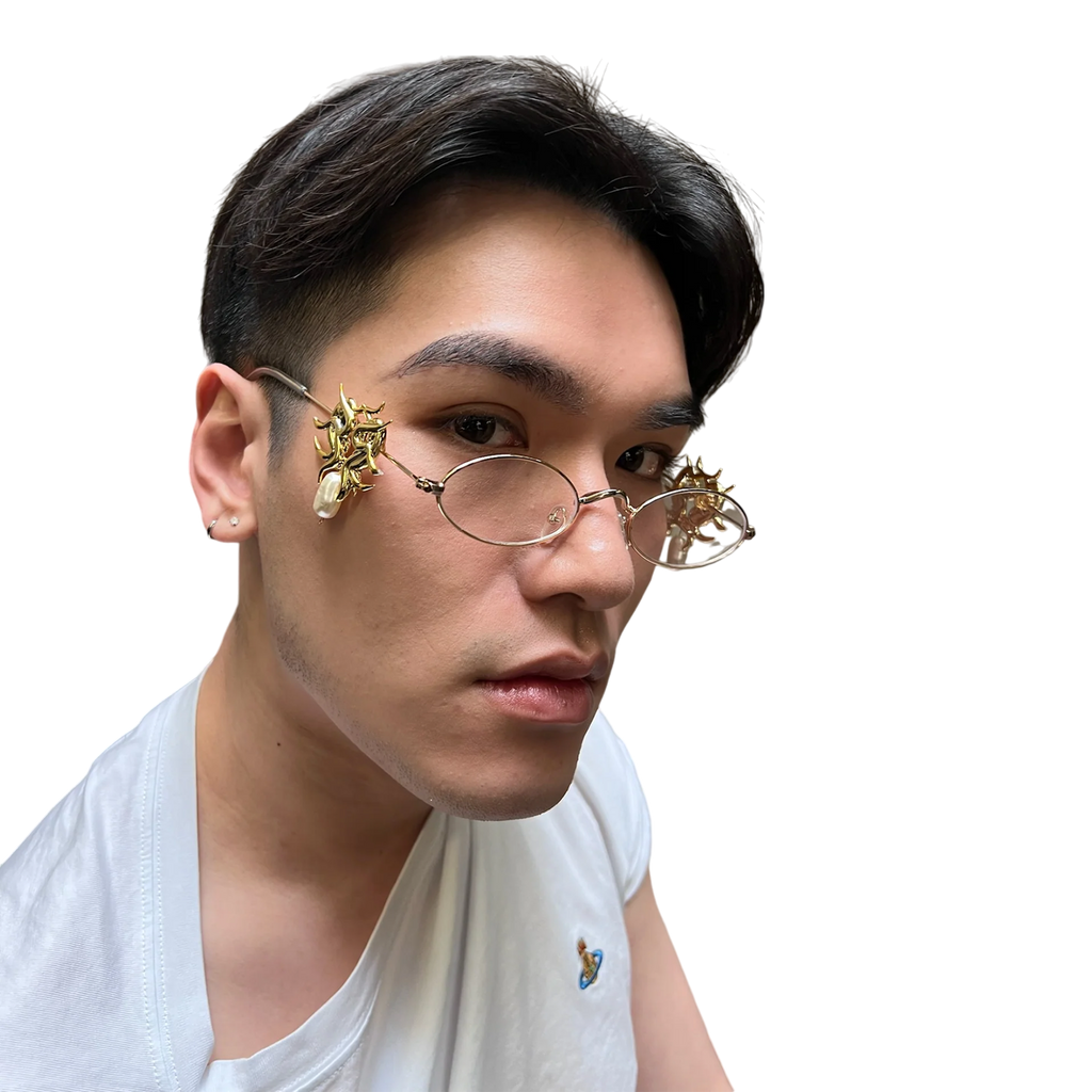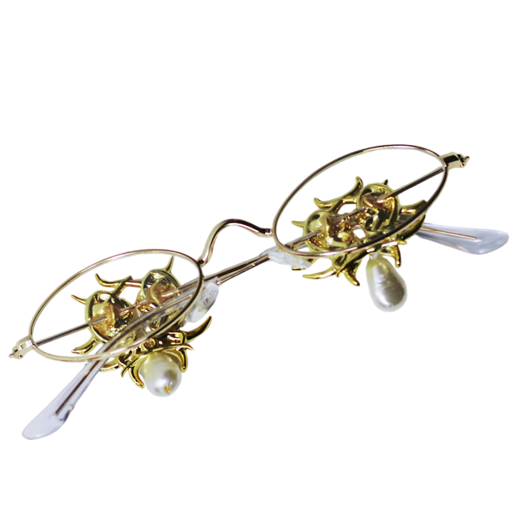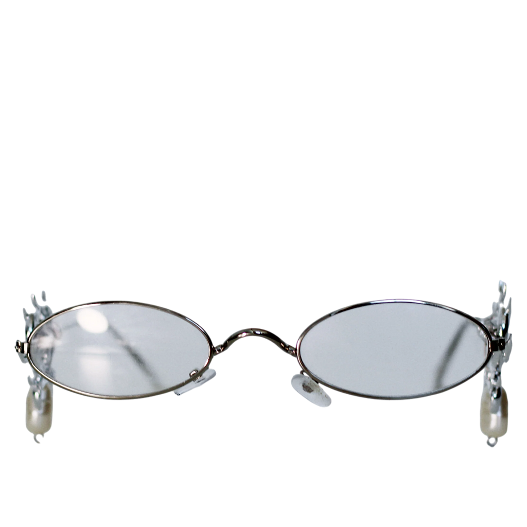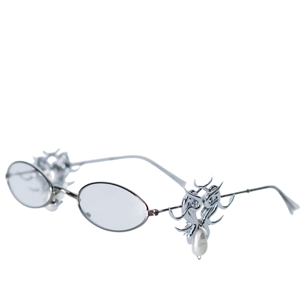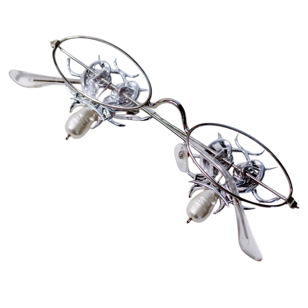 Elevate your eyewear collection with these stunning platinum glasses featuring clear lenses. The temples are crafted from 3D printed resin, elegantly electroplated in silver and adorned with synthetic pearls, offering a unique blend of luxury and modern design.