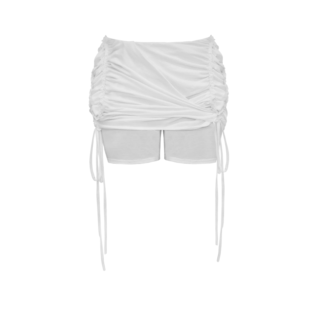 The Circle Frame Skirt Pant features soft stretchy jersey fabric for all-day comfort, paired with a ruched skirt layered over built-in shorts for stylish coverage. A drawstring ribbon detail on the side adds a charming accent. This versatile design effortlessly combines comfort and fashion, making it a perfect choice for your casual wardrobe.
