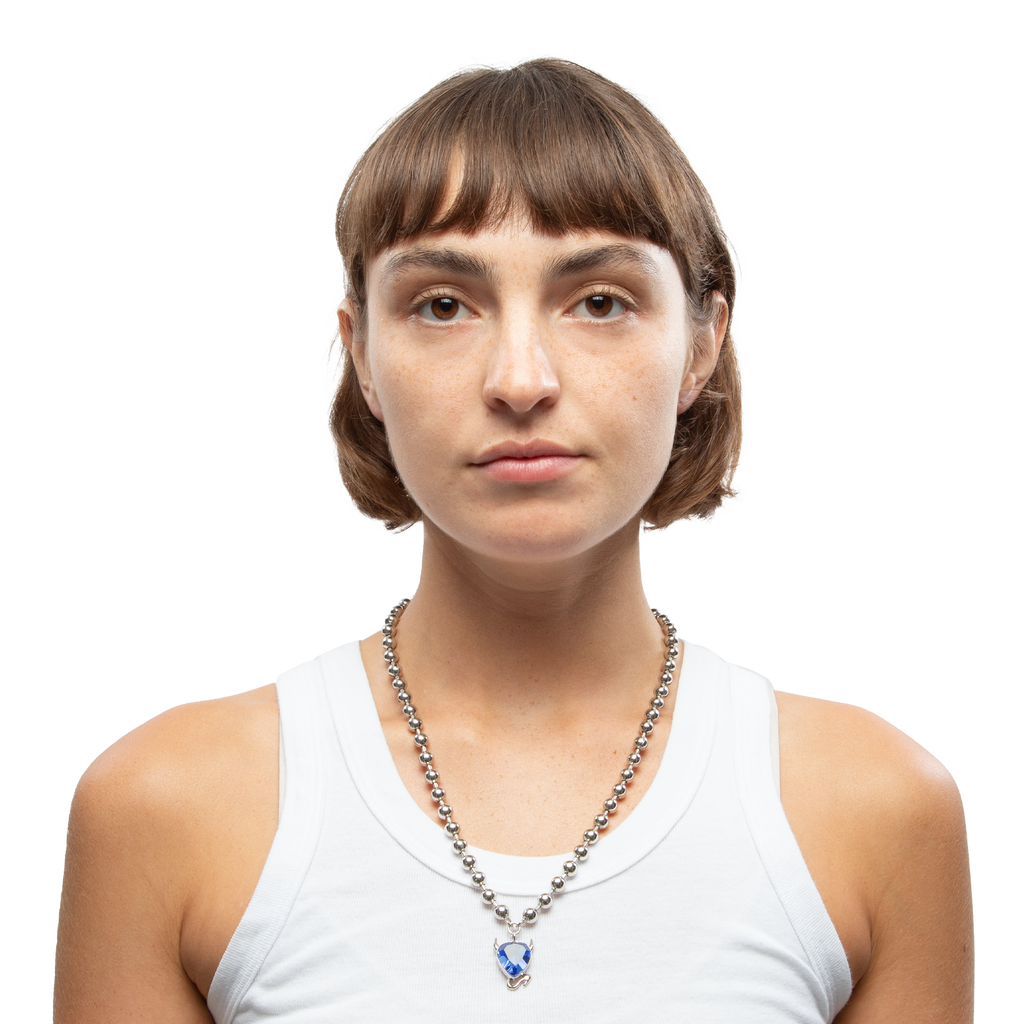 Silver ball chain with a devil shaped frame embellished with a blue shaphire crystal heart .