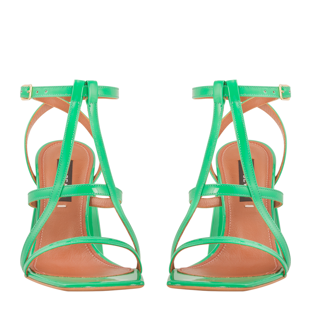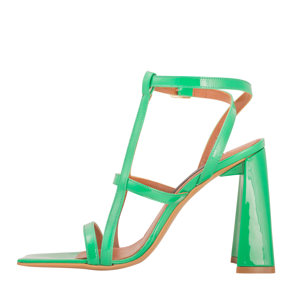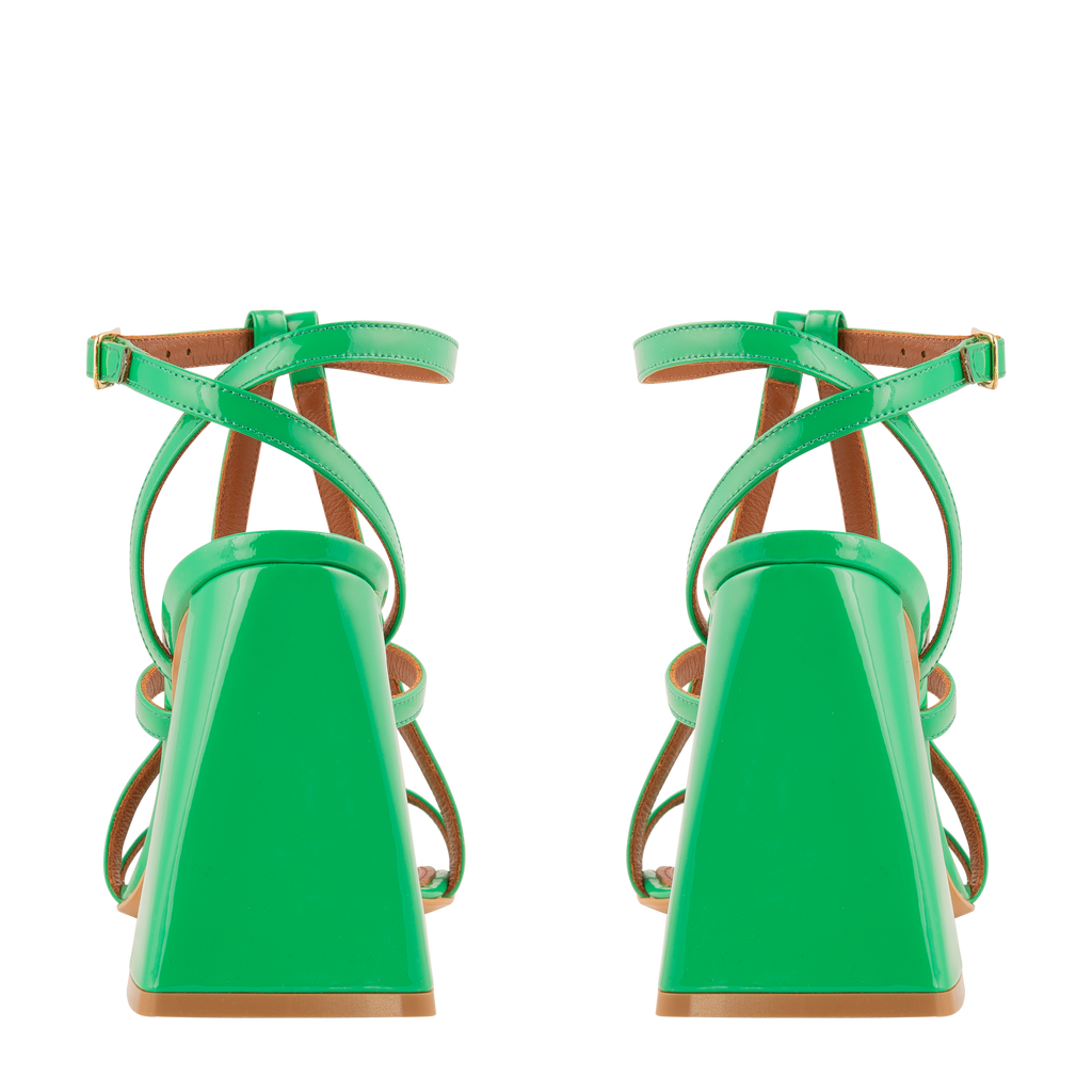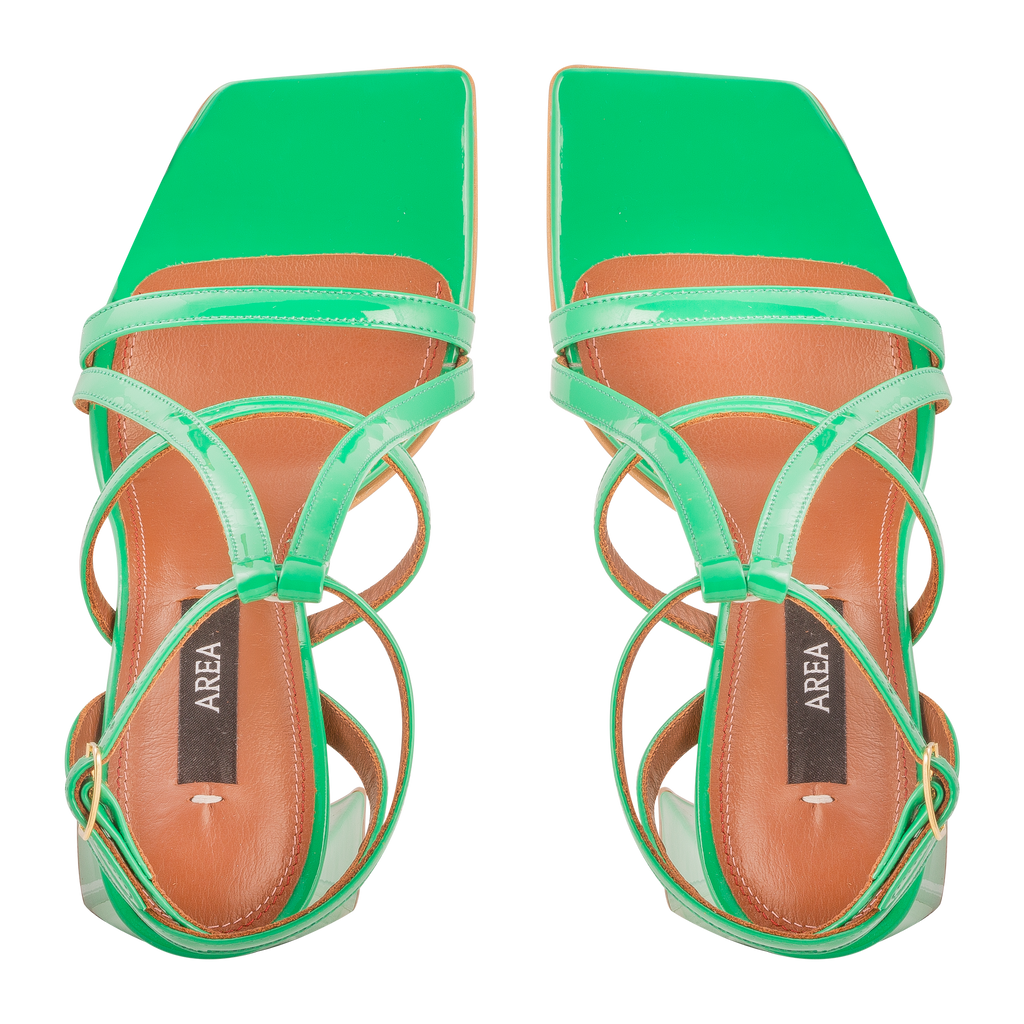 Assembled in Italy with green patent calfskin leather. Styled with Areas signature 'A" block heel. This pair secures at the ankle with a wraparound adjustable buckle closure. 4.13" heel.