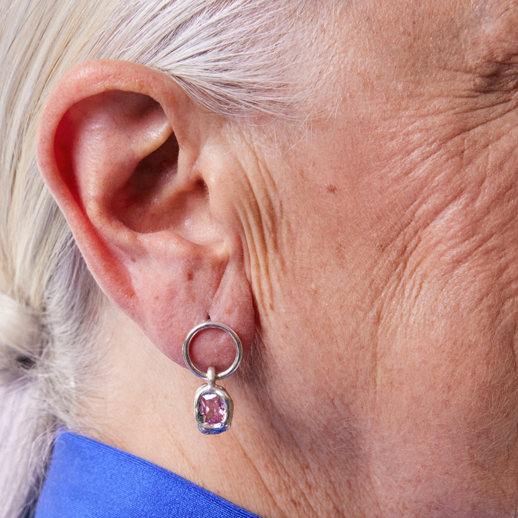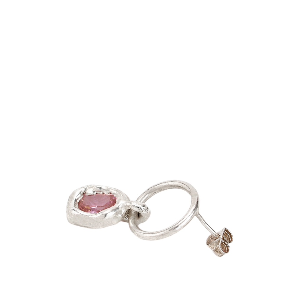 Silver earrings with pendant pink zircon wraped by little spots. Butterfly fastening.