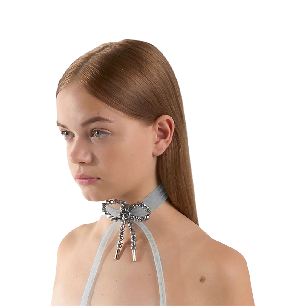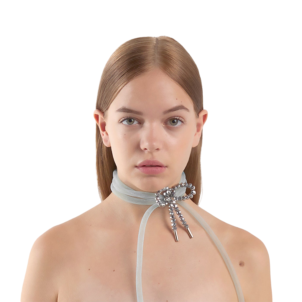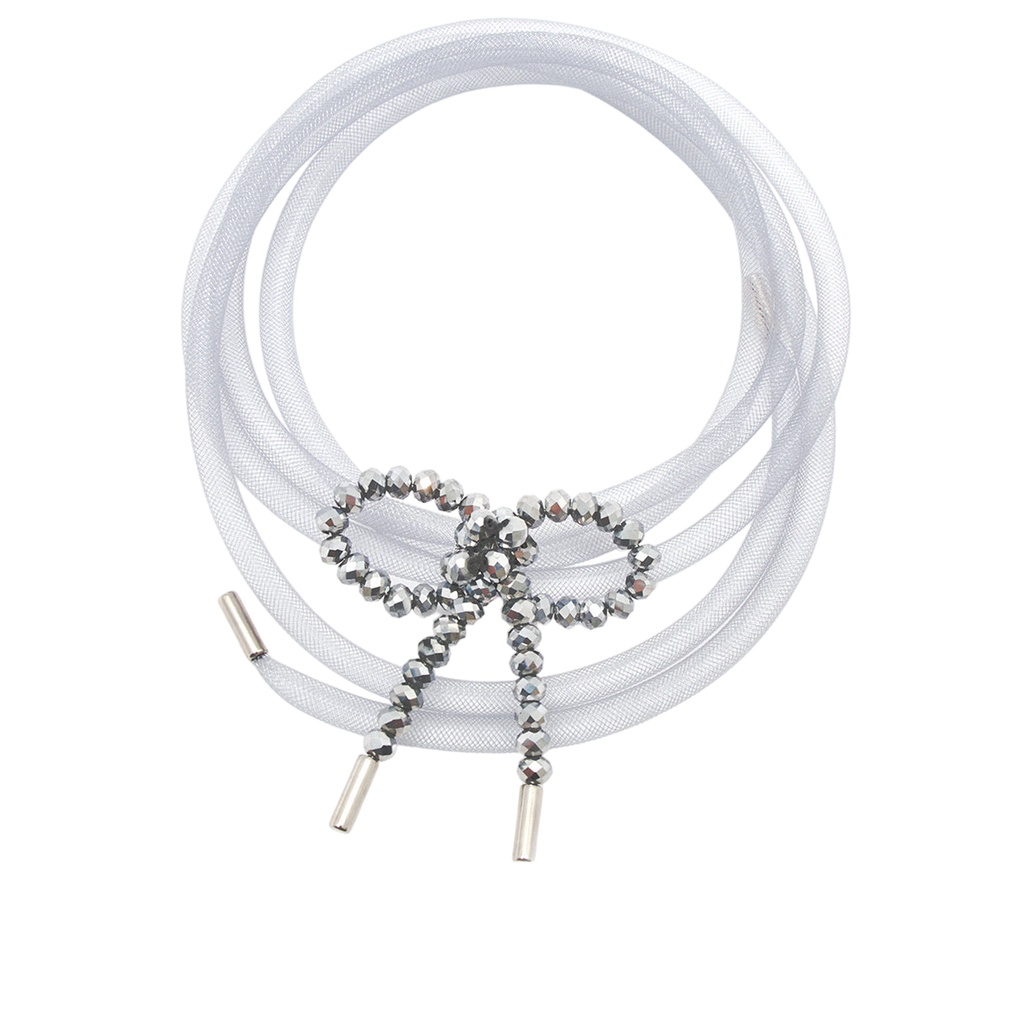 Handcrafted with meticulous detail, this amazing necklace features faceted jade stones and a grey glazed brass barrette. The nylon lace is stretchable and super comfortable, with metallic ends for added flair.