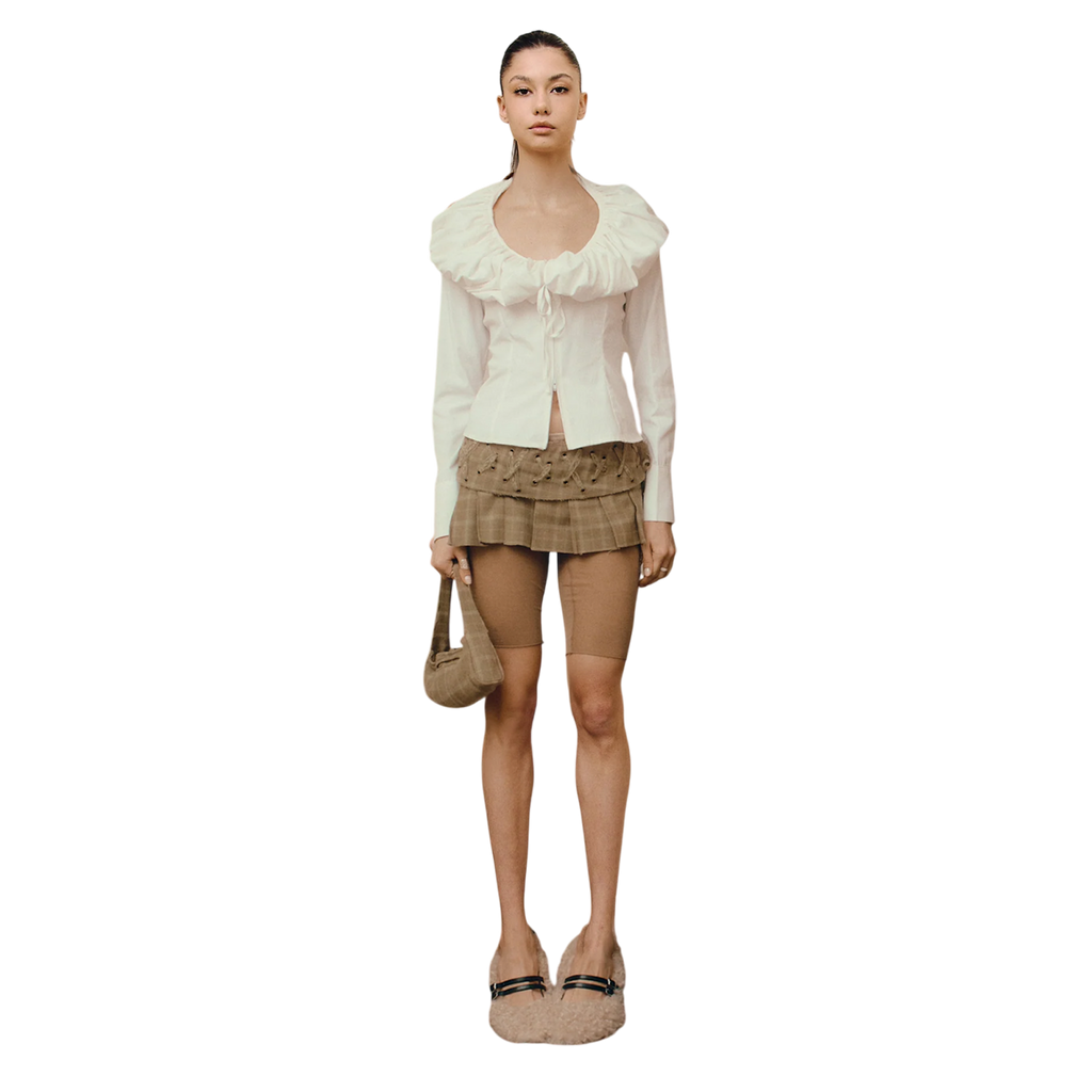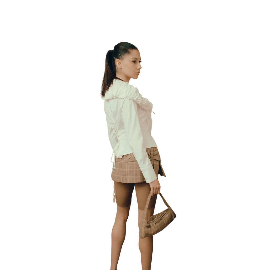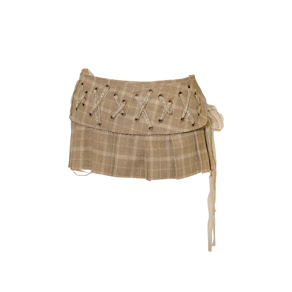 Give your look a fun upgrade with the Olivia Micro Belt Skirt! Crafted from cozy olive plaid wool, it stands out with a quirky belt that adds a dash of charm. The pleated, micro-length style creates a flattering, modern shape perfect for any adventure. Plus, the delicate lace and crisscross details bring a sweet, romantic vibe that makes this skirt a playful blend of classic and cool.