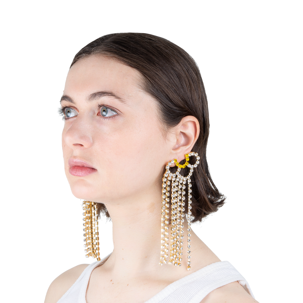 Crystal fringe petal chandelier earrings in clear yellow.