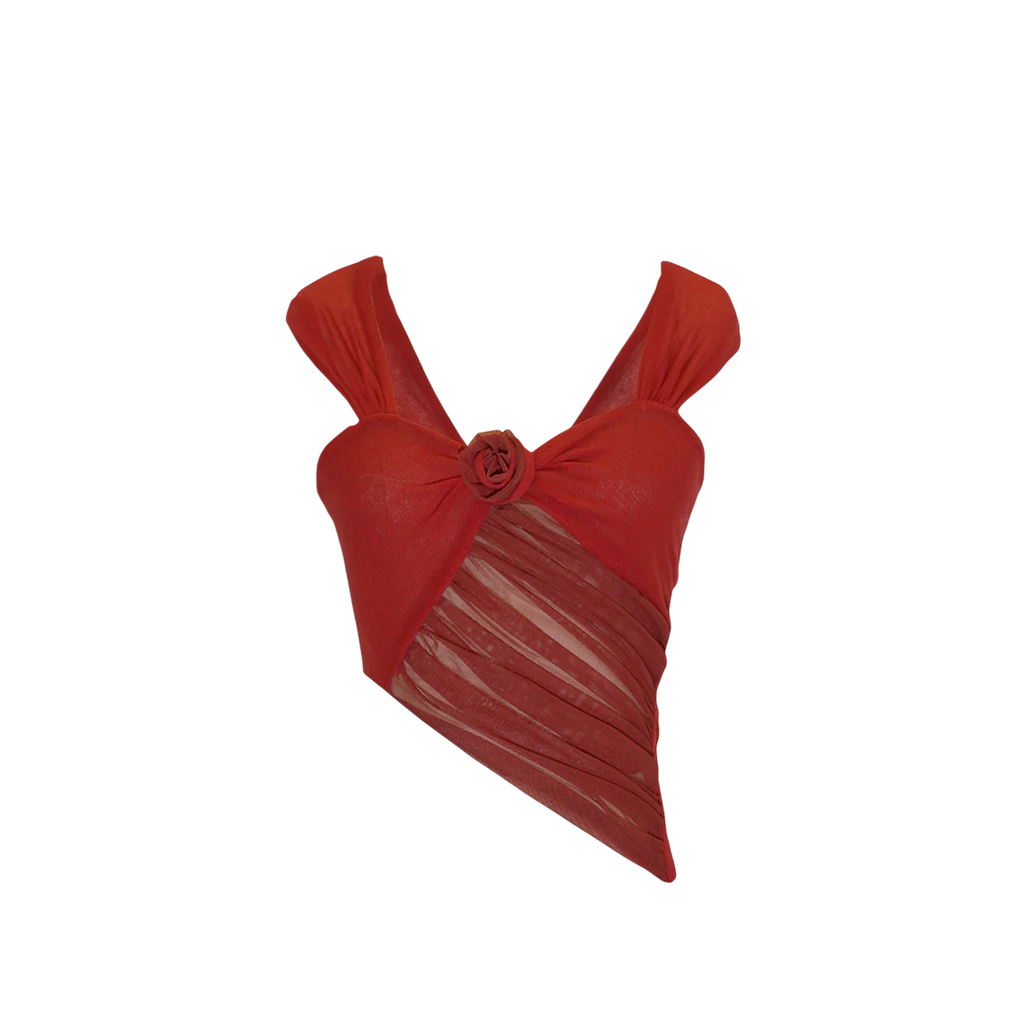 The Red Talk mesh flower asymmetric top adds an effortless yet bold and iconic touch to your wardrobe. The center rosette decorations provide an elegant focal point.
