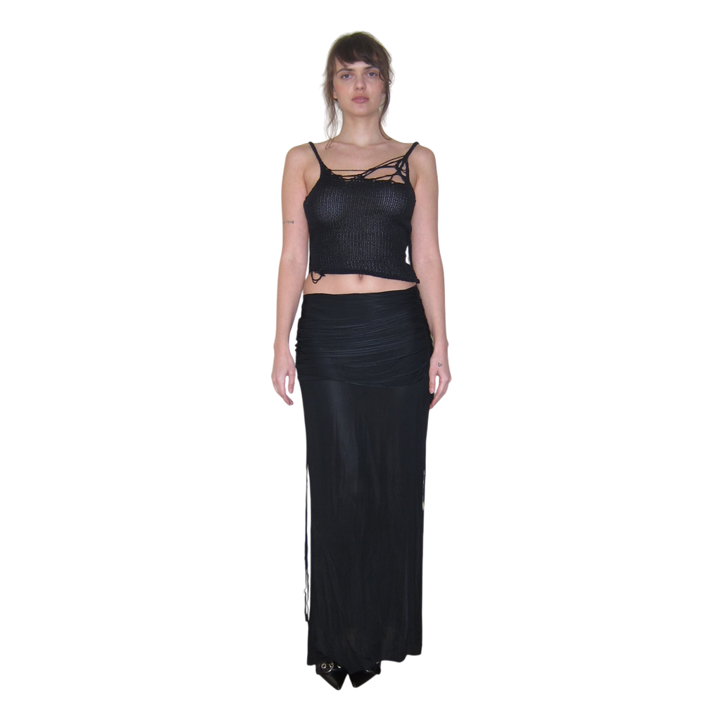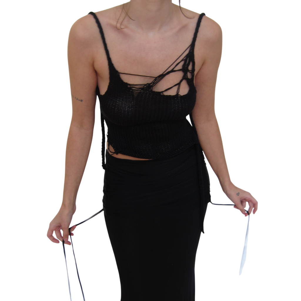 This 100% cotton hand-knitted top features a signature V4K pattern on the chest and an asymmetric bottom line. Each pattern is one-of-a-kind, retaining its shape over time. The open back with adjustable ties ensures a personalized fit. Soft, breathable, and perfect for any season.