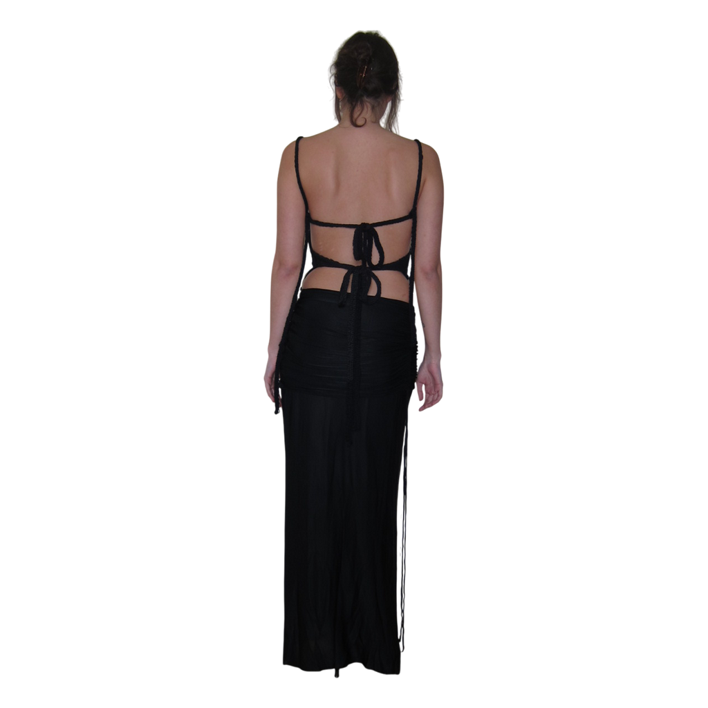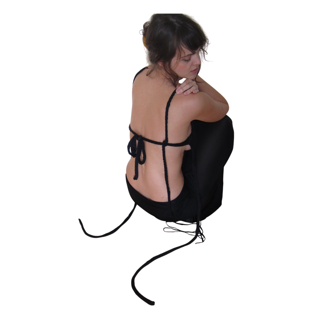 • Open back with long adjustable ties.