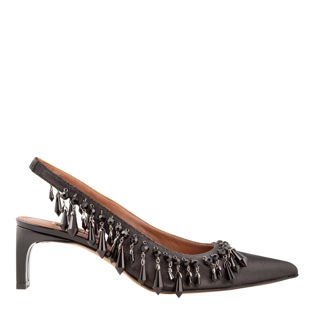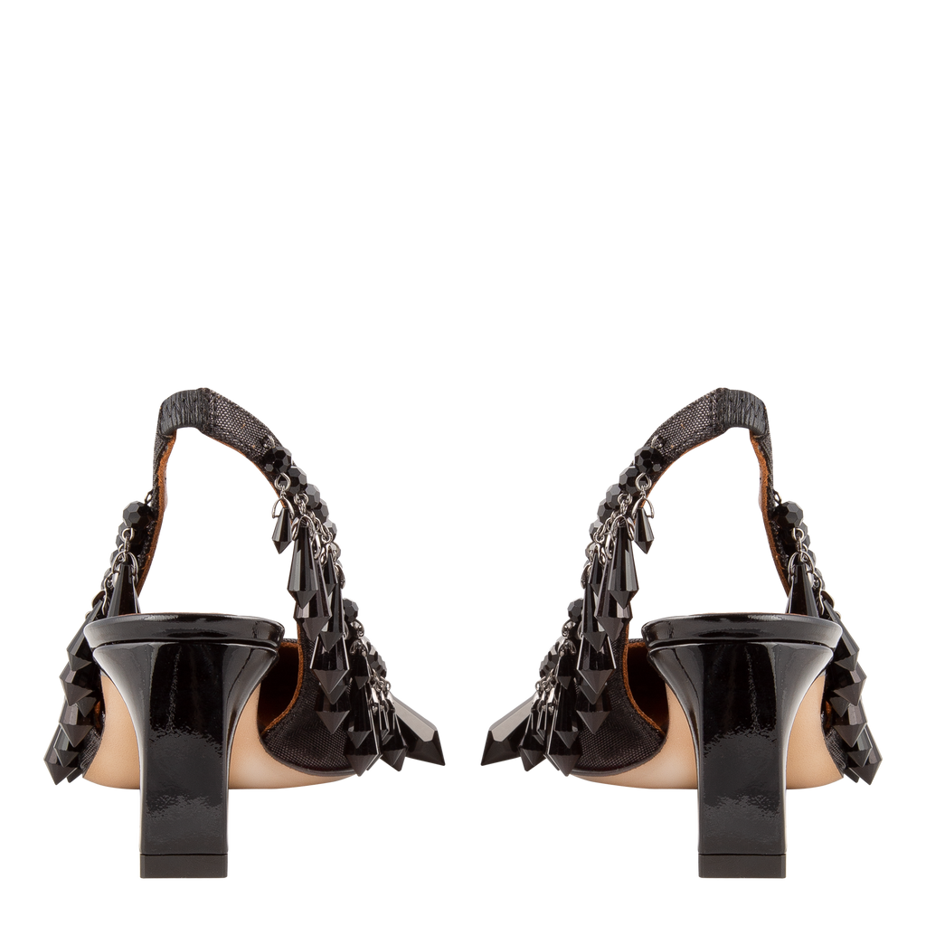 Pointed-toe slingback kitten heel assembled in black leather detailed with black acrylic beaded tassels. 2.36" heel.