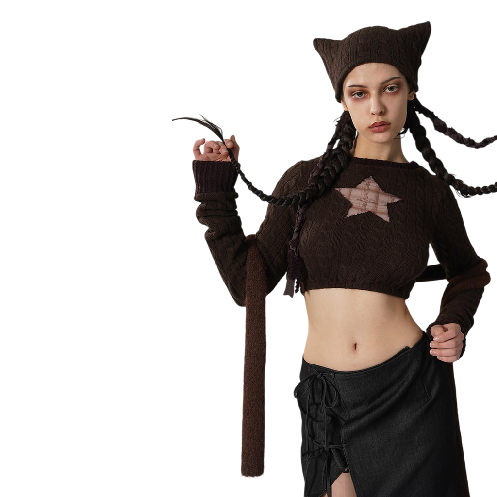This crop knit sweater features a star shape deatil with unique mesh checkered pattern on the front, making it stand out from the rest.The extra long sleeves offer a unique gathering detail when you wear it, making for a trendy and comfortable fit.