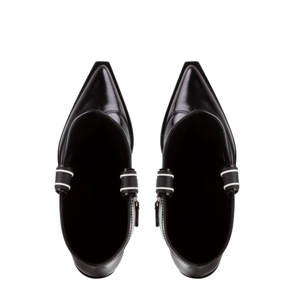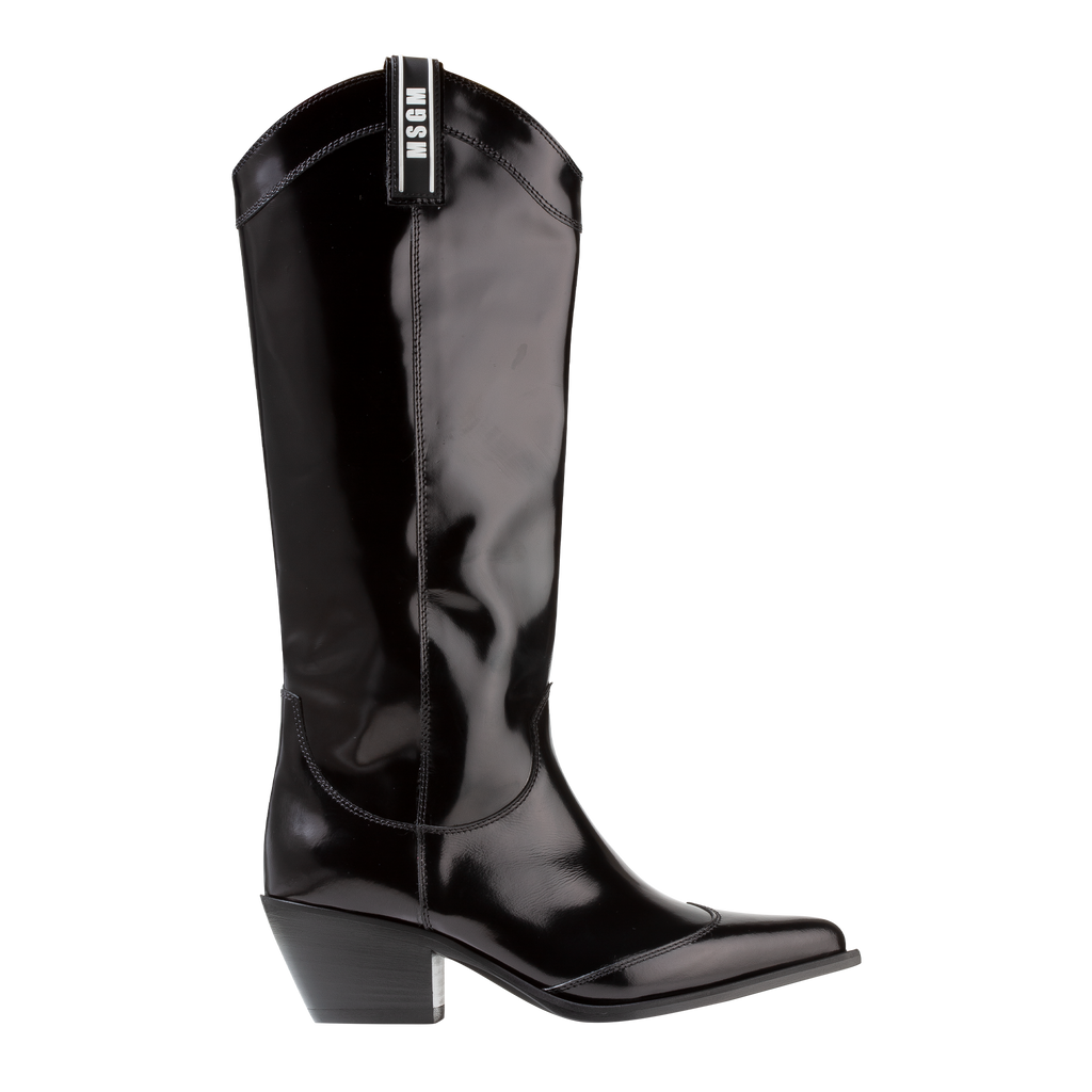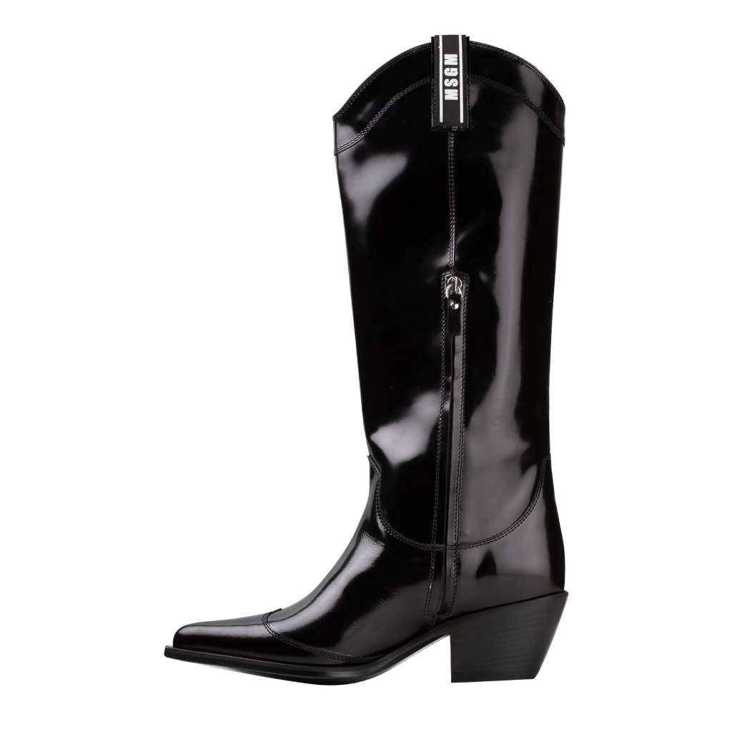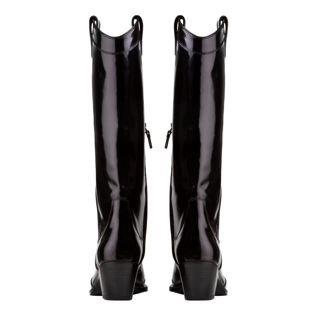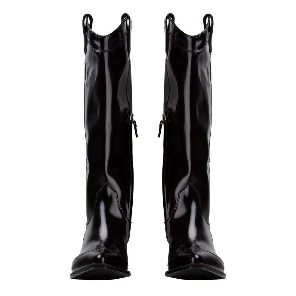 Black patent leather high cut Texan boots. Featuring a pointed toe and zip at the side. Fits true to size. Approx. 1.77" heel.