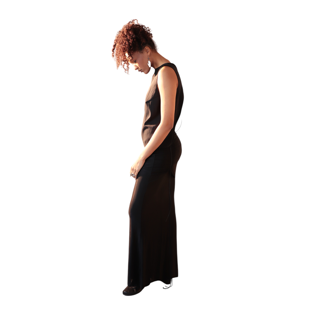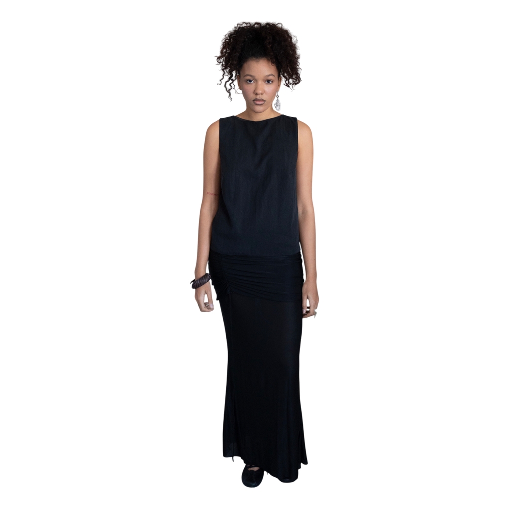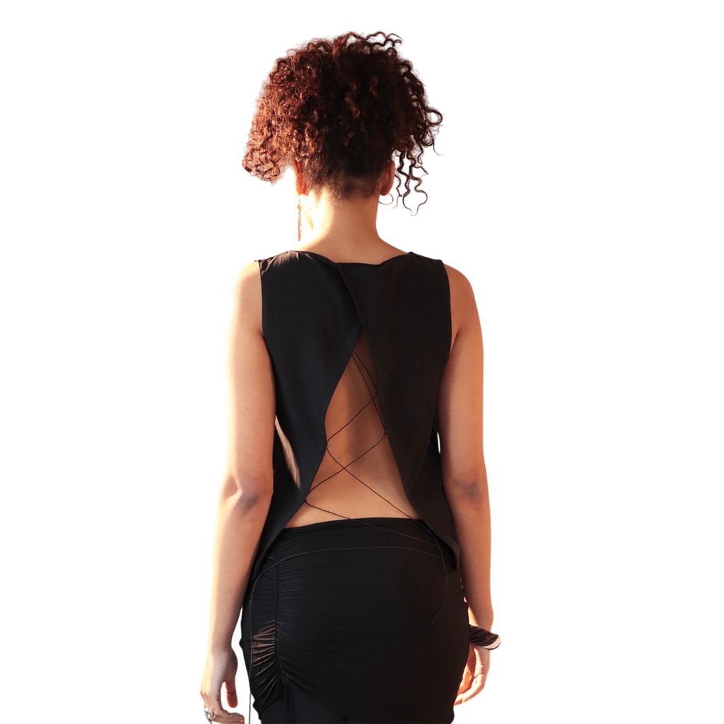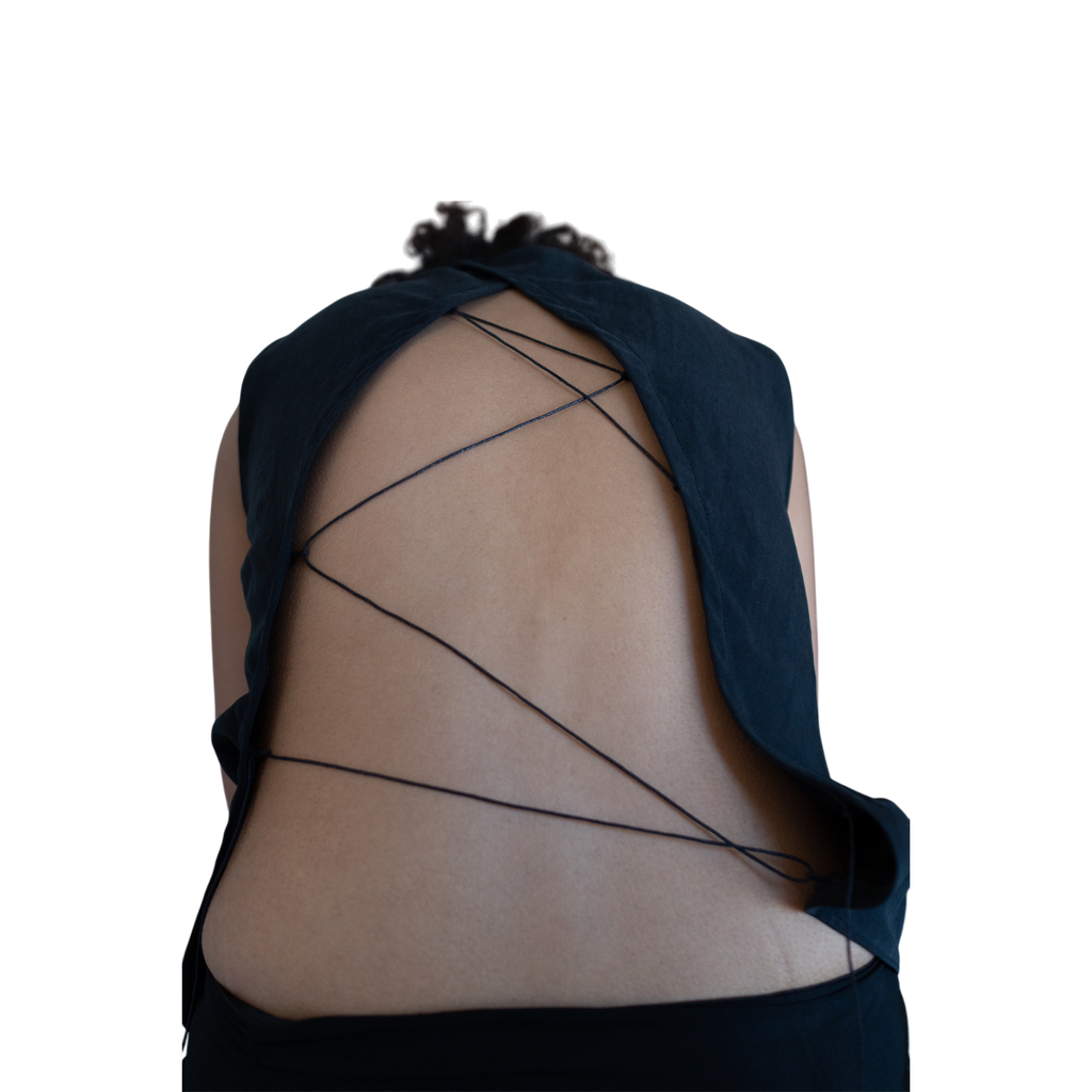 This top is crafted from 100% matte linen, featuring a classic front and an open back with an asymmetric tie (removable). Lightweight and breathable, it offers a relaxed yet refined fit.