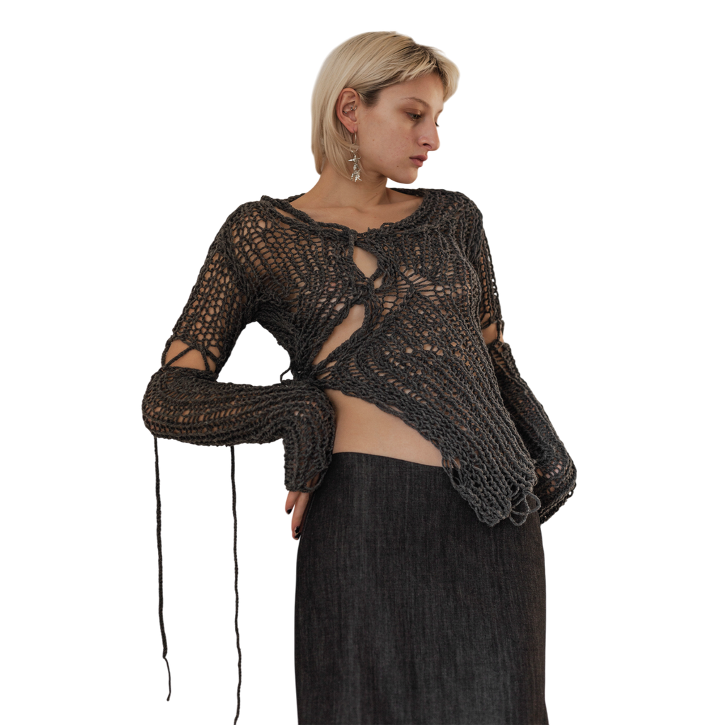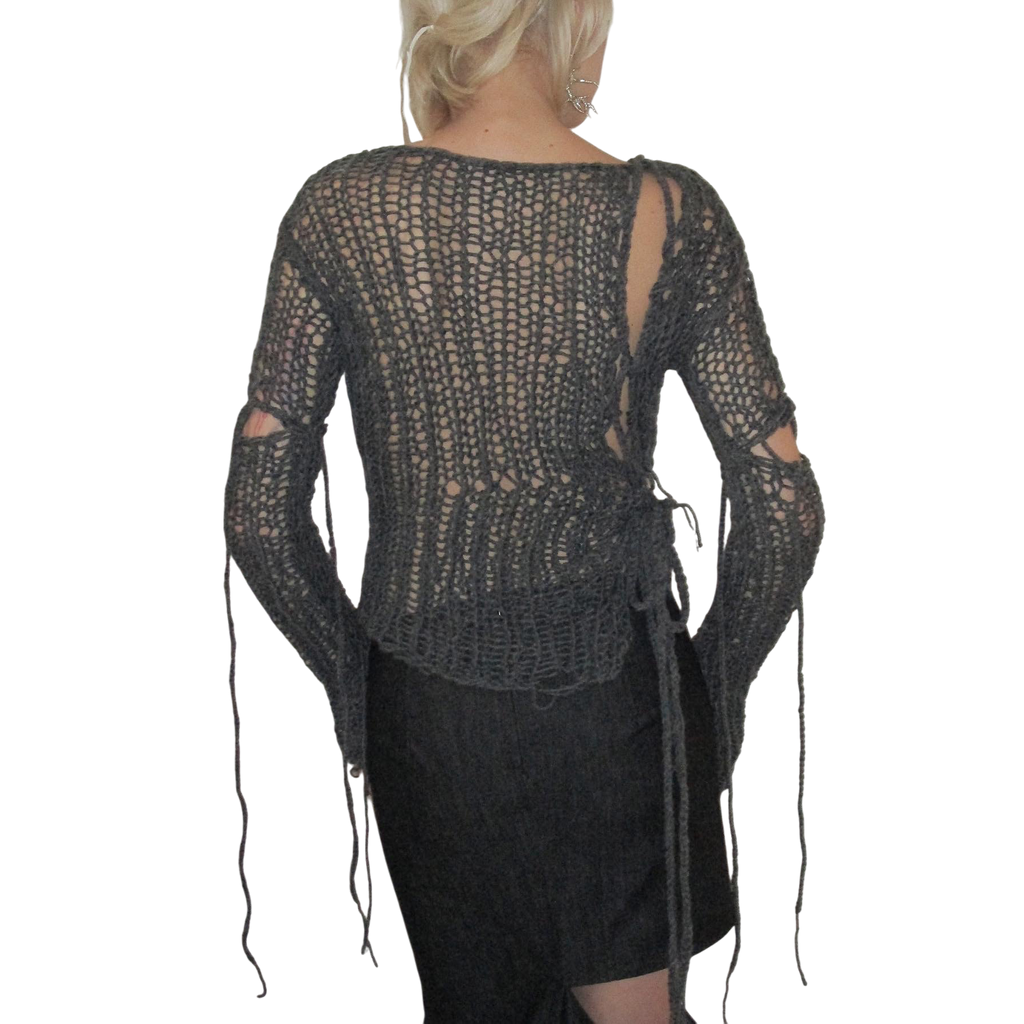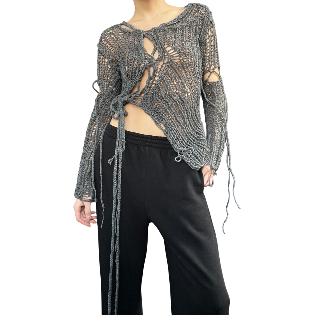 Tie yourself up in style with this hand-knitted top, featuring an elegant curved pattern and textured openwork on the front and back. Adjustable crocheted ties allow you to customize the fit and design, making it truly your own.