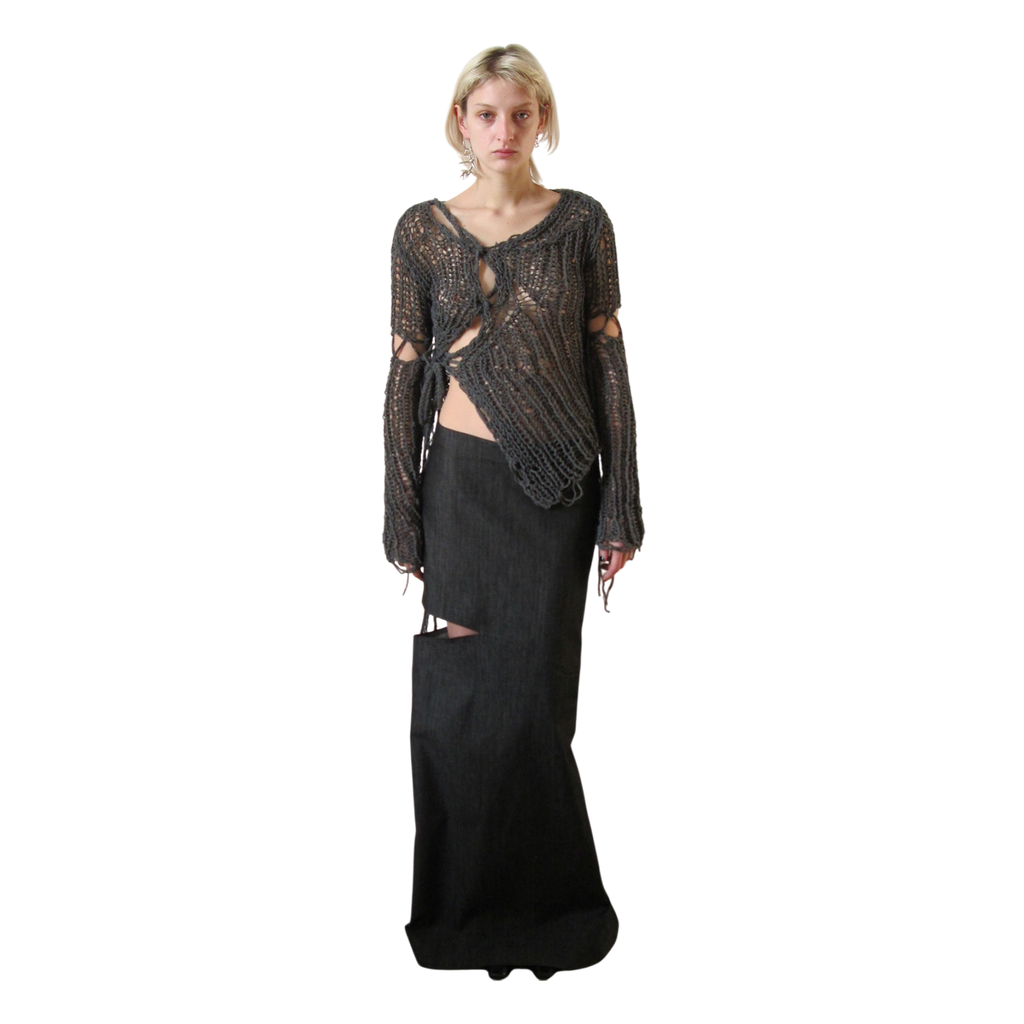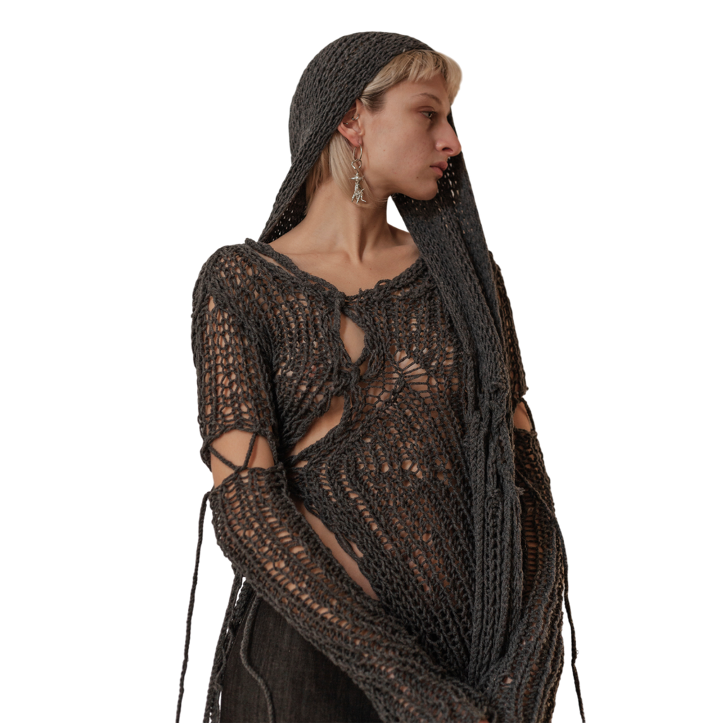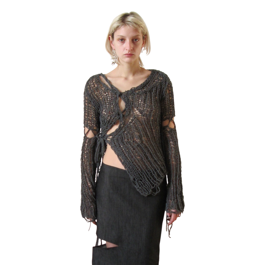 Tie yourself up in style with this hand-knitted top, featuring an elegant curved pattern and textured openwork on the front and back. Adjustable crocheted ties allow you to customize the fit and design, making it truly your own.