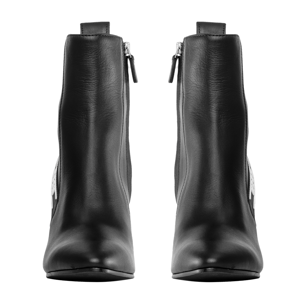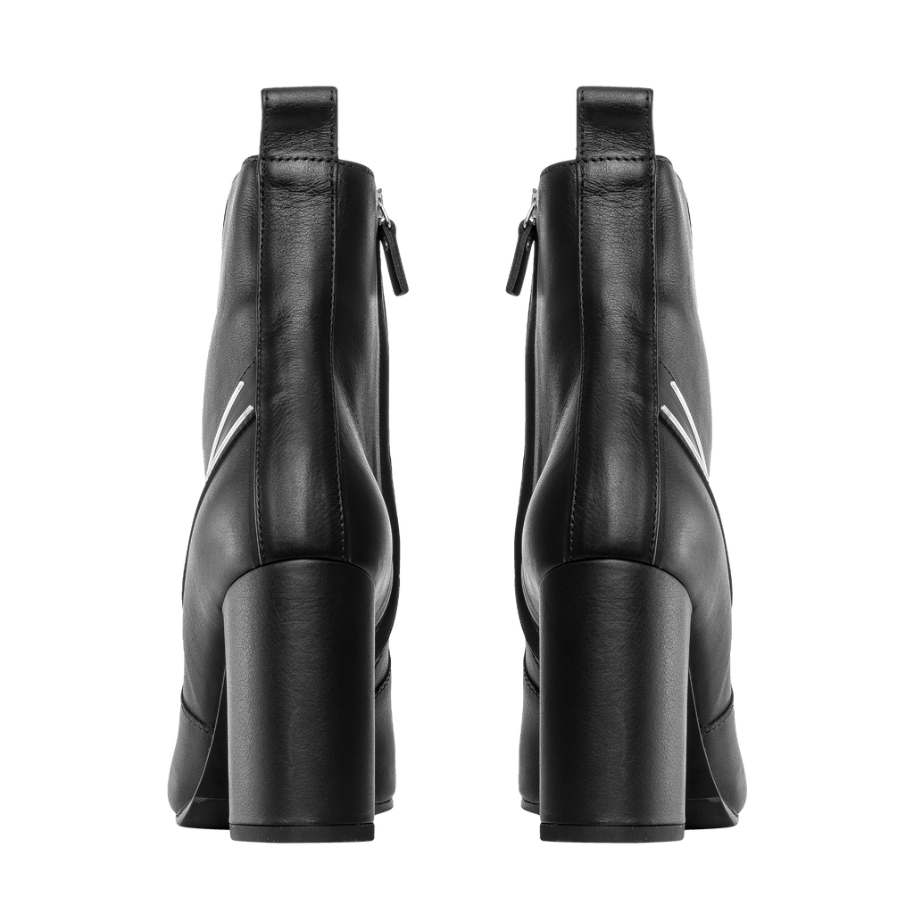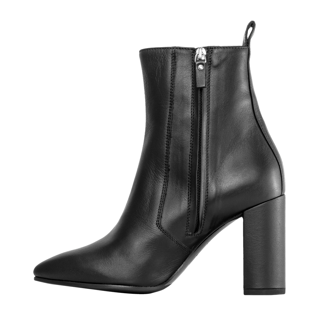 Black calf leather ankle boots. Featuring a pointed toe and zip at the side. Fits true to size. Approx. 4" heel.