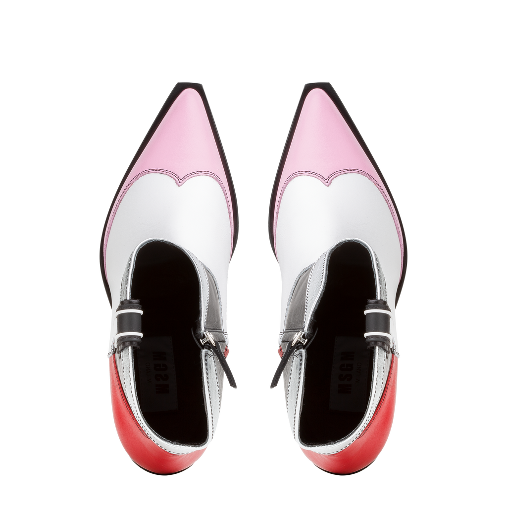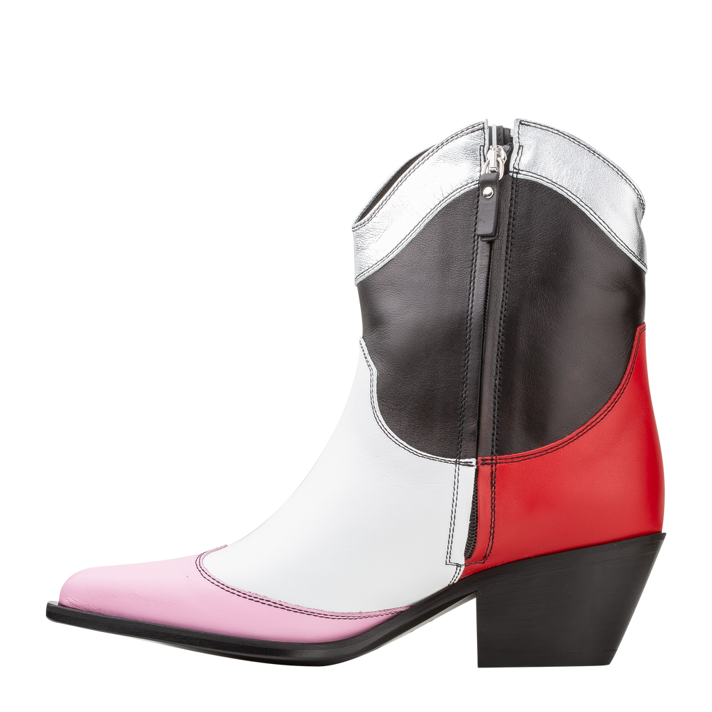 Black/red/pink calf leather Texan ankle boots. Featuring a pointed toe and zip at the side. Fits true to size. Approx. 1.77" heel.