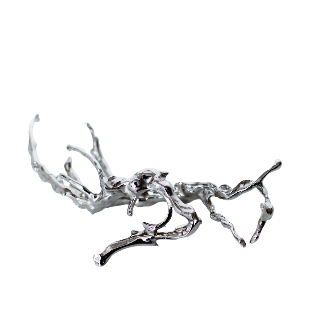 KONSENSUSS, founded in 2022 by Abbir Malik and Winnie Hao, emerged from a shared passion for accessories and adornment. Though they never met at Parsons School of Design, fate connected them in a 9-to-5 fashion job. Bonding over their love for fantasy in movies, video games, and avatars, they pursued jewelry-making after hours, sparking the creation of KONSENSUSS. Combining 3D modeling, printing, analog sculpting, and various materials, the duo crafts bold, avant-garde pieces that challenge conventional design.