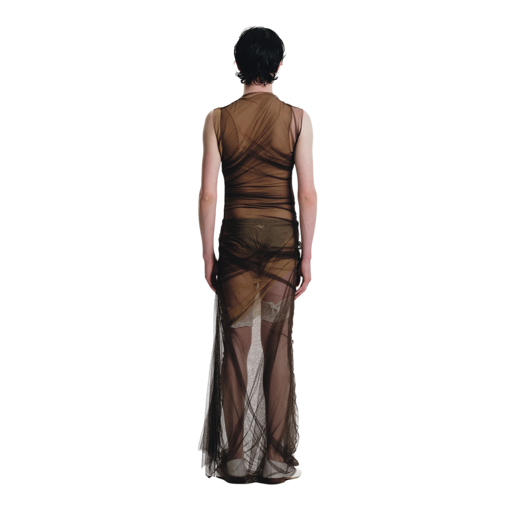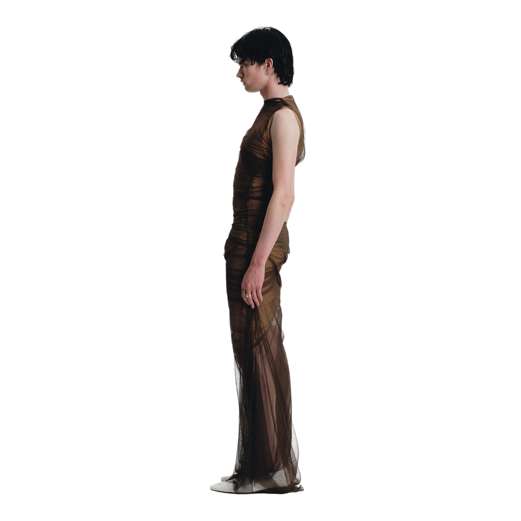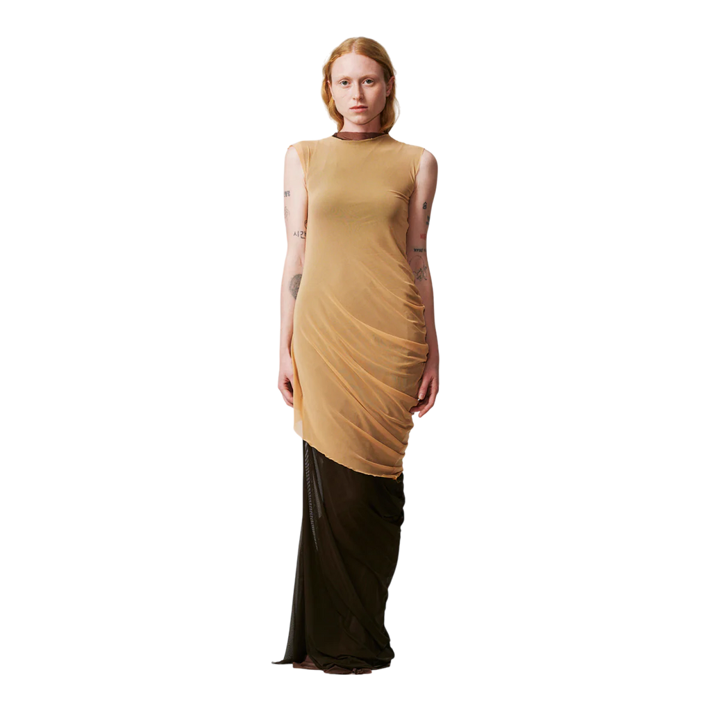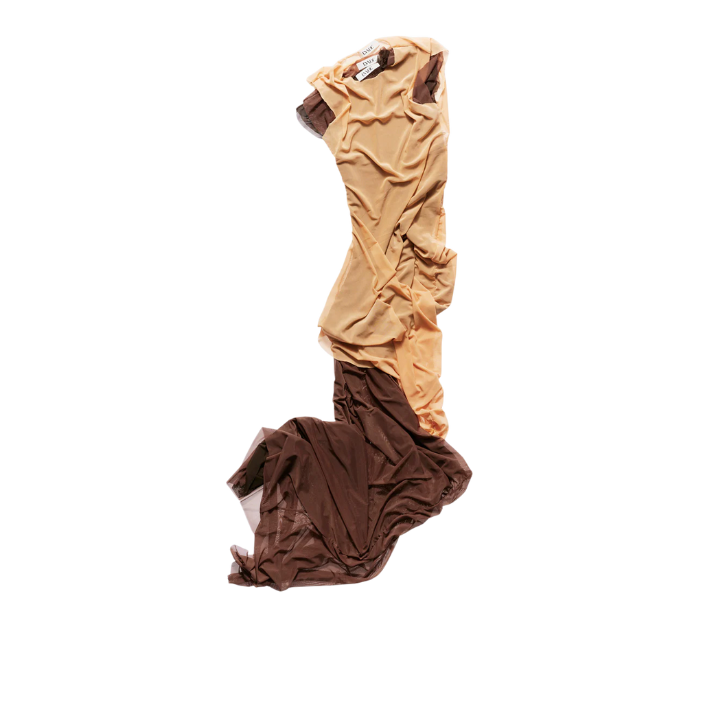 Handcrafted in our Madrid studio, this full-length dress showcases three layers—rich chocolate brown, lighter brown, and beige—offering versatility in textures and tones. Designed with a round neck and sleeveless cut, it features a ruched effect at the hip for an elegant, dynamic silhouette.