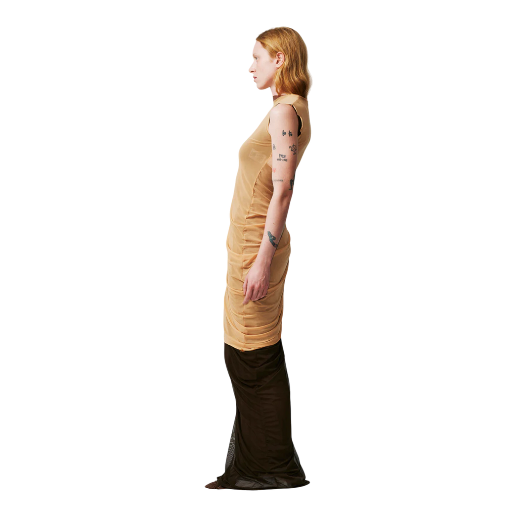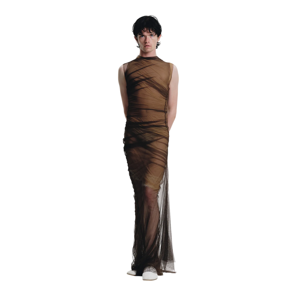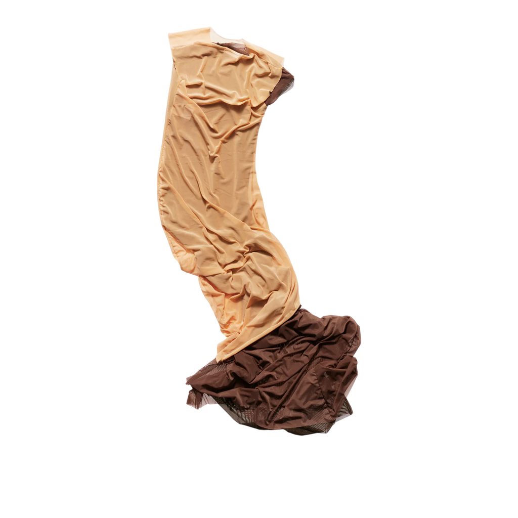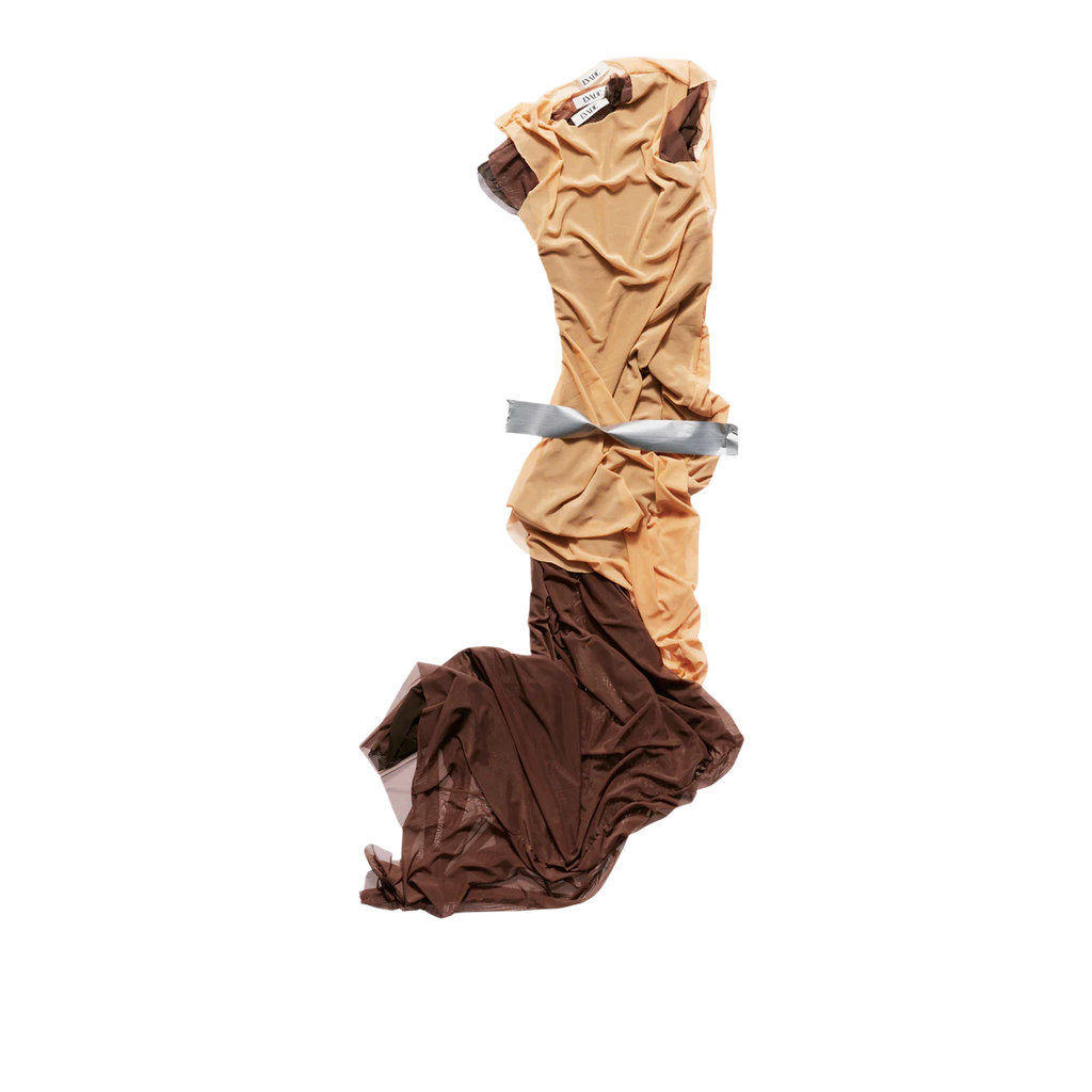 Handcrafted in our Madrid studio, this full-length dress showcases three layers—rich chocolate brown, lighter brown, and beige—offering versatility in textures and tones. Designed with a round neck and sleeveless cut, it features a ruched effect at the hip for an elegant, dynamic silhouette.