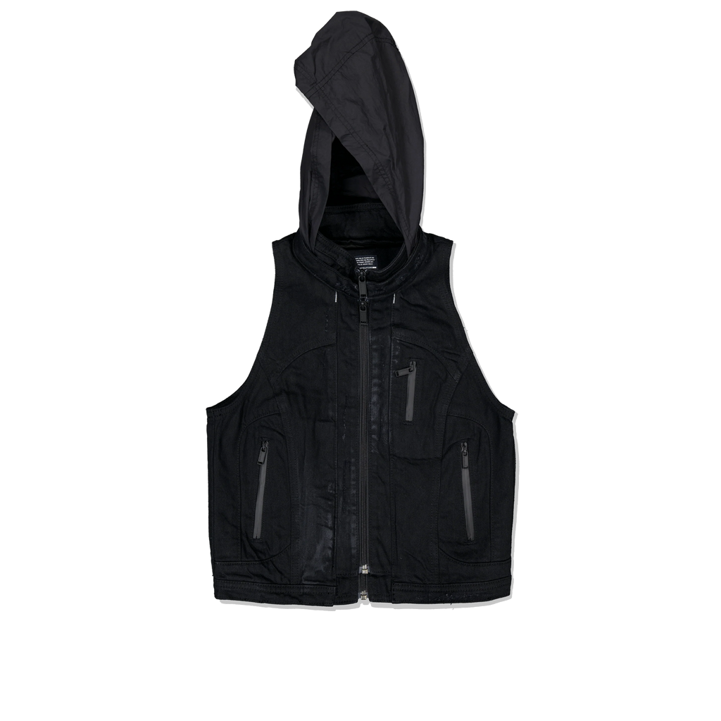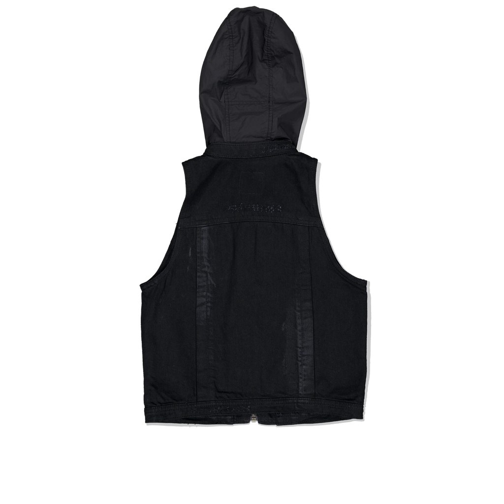Crafted from premium black Japanese denim, our small-fit jacket is as stylish as it is functional. It features a waterproof zipper at the left chest/side pocket, ensuring your belongings stay dry in inclement weather. The jacket also includes an earphone hole at the left chest pocket for added convenience. The design is highlighted by two unbalanced nylon zippers at the front, adding a modern and edgy touch. A foldable hood with a zipped closure provides versatility and protection from the elements. The jacket is finished with a trendy dirty effect and damage effect, giving it a unique and worn-in look.
