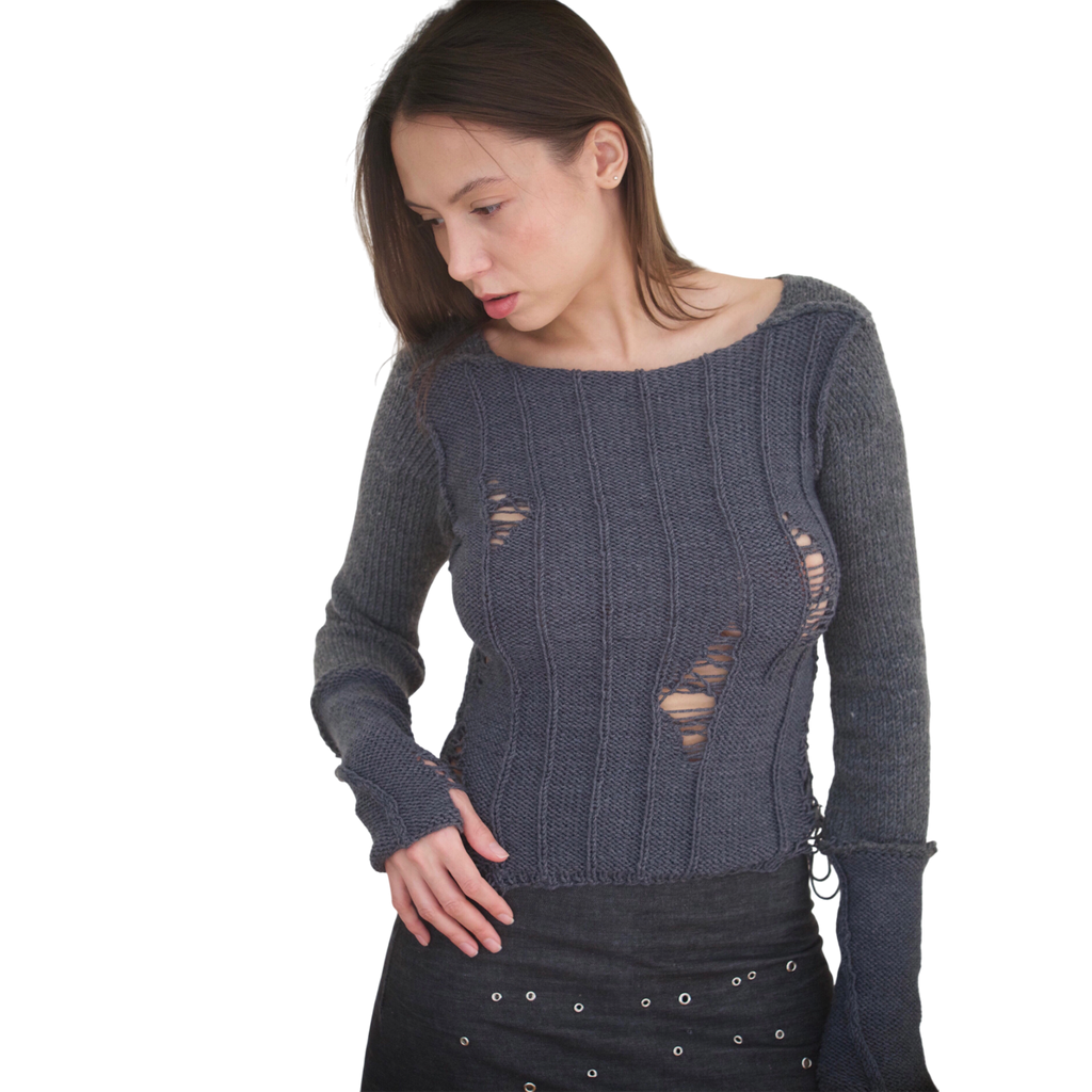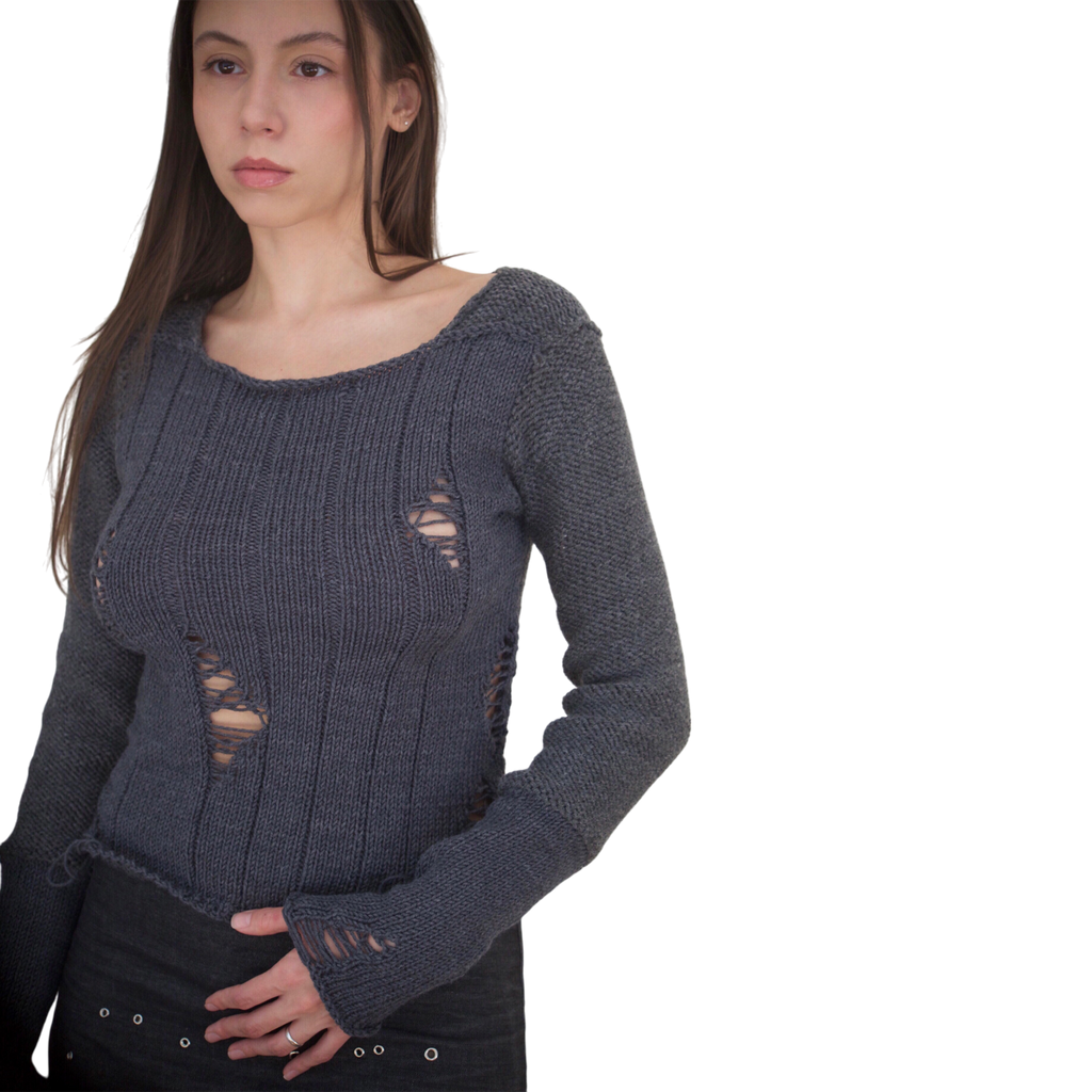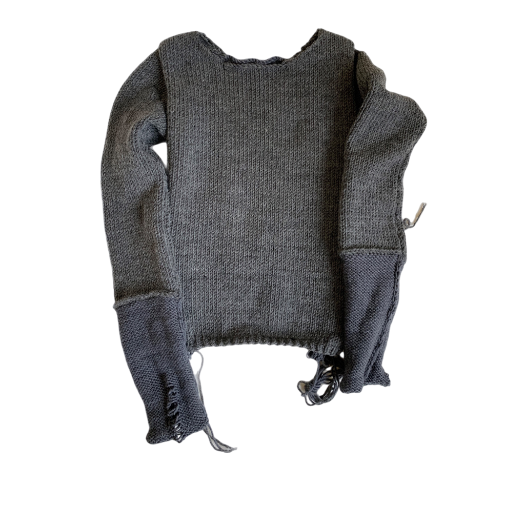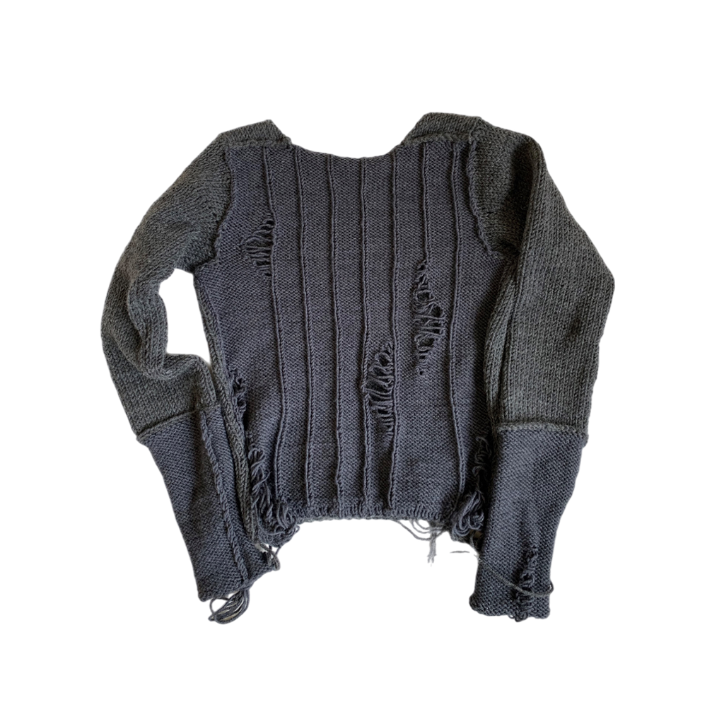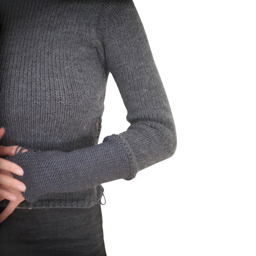 This warm and cozy knit sweater comes in two shades of gray, offering a versatile design with reversible sides for different looks based on your mood. We combine hand-knitting and machine knitting techniques to craft a natural and unique design, made by skilled artisans. The back features a special manually-created pattern with holes for added texture.