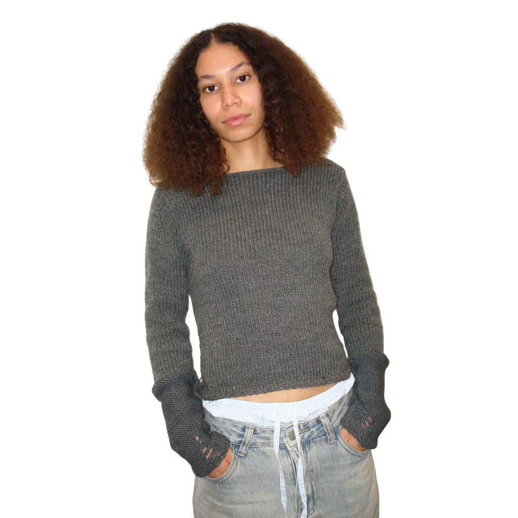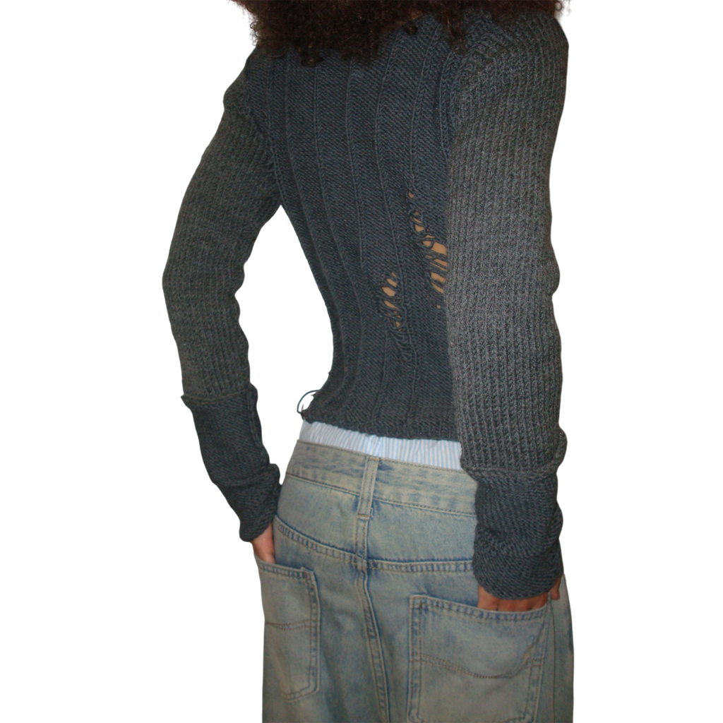 - Slim fit, with a hand-knitted back design featuring unique holes and pattern.