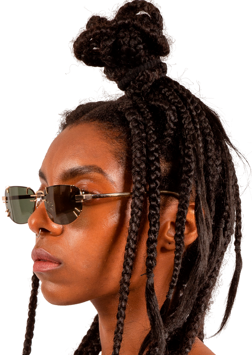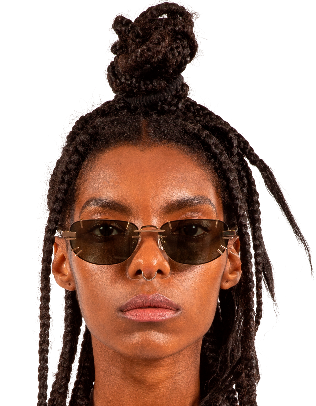 Rectangular stainless steel sunglasses horn / light gold. Double bridge. Olive green lenses with 100% UV protection. Part of the Y/Project x Linda Farrow collaboration.